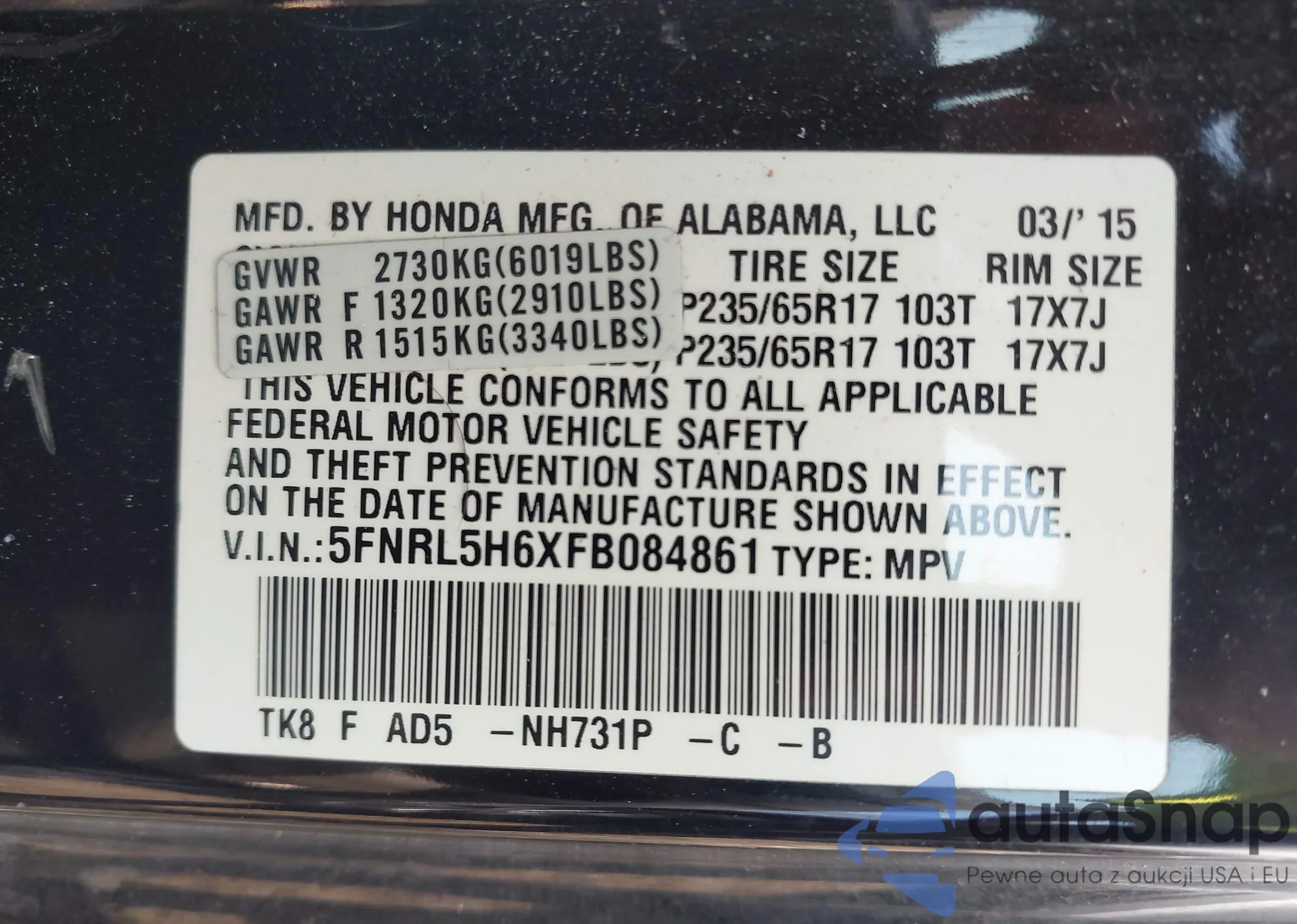 • VIN 5FNRL5H6XFB084861