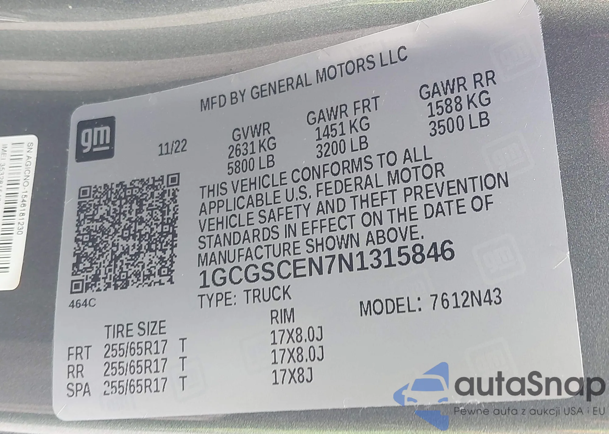 LOT: 42133330 VIN: 1GCGSCEN7N1315846