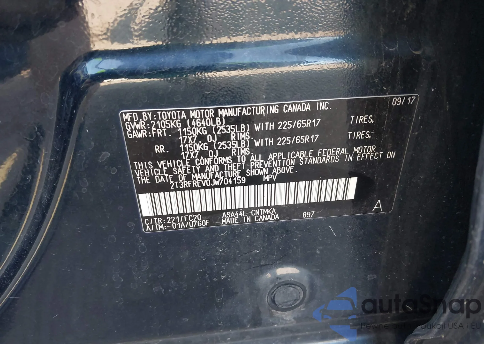 LOT: 42376892 VIN: 2T3RFREV0JW704159