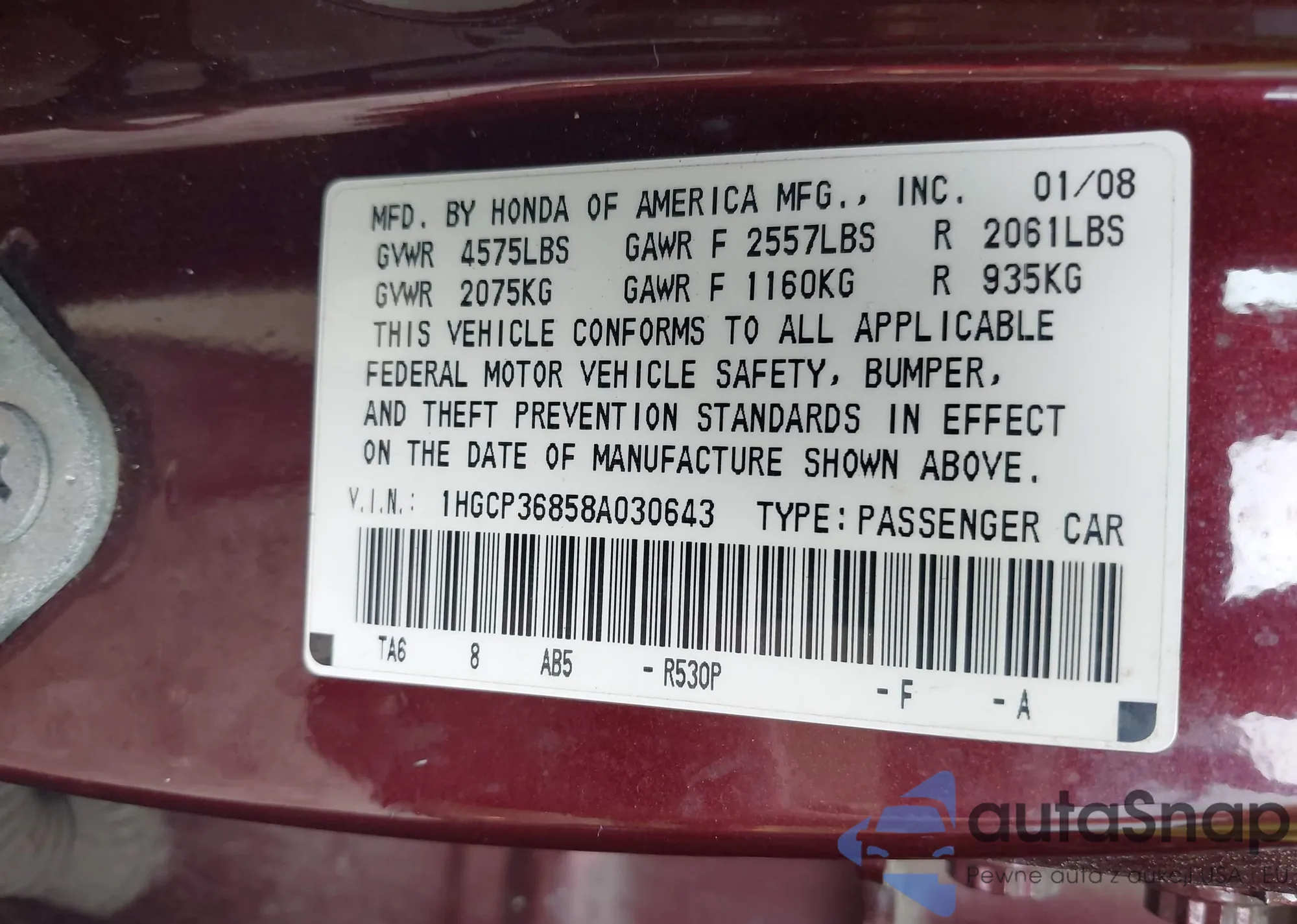 LOT: 42534408 VIN: 1HGCP36858A030643