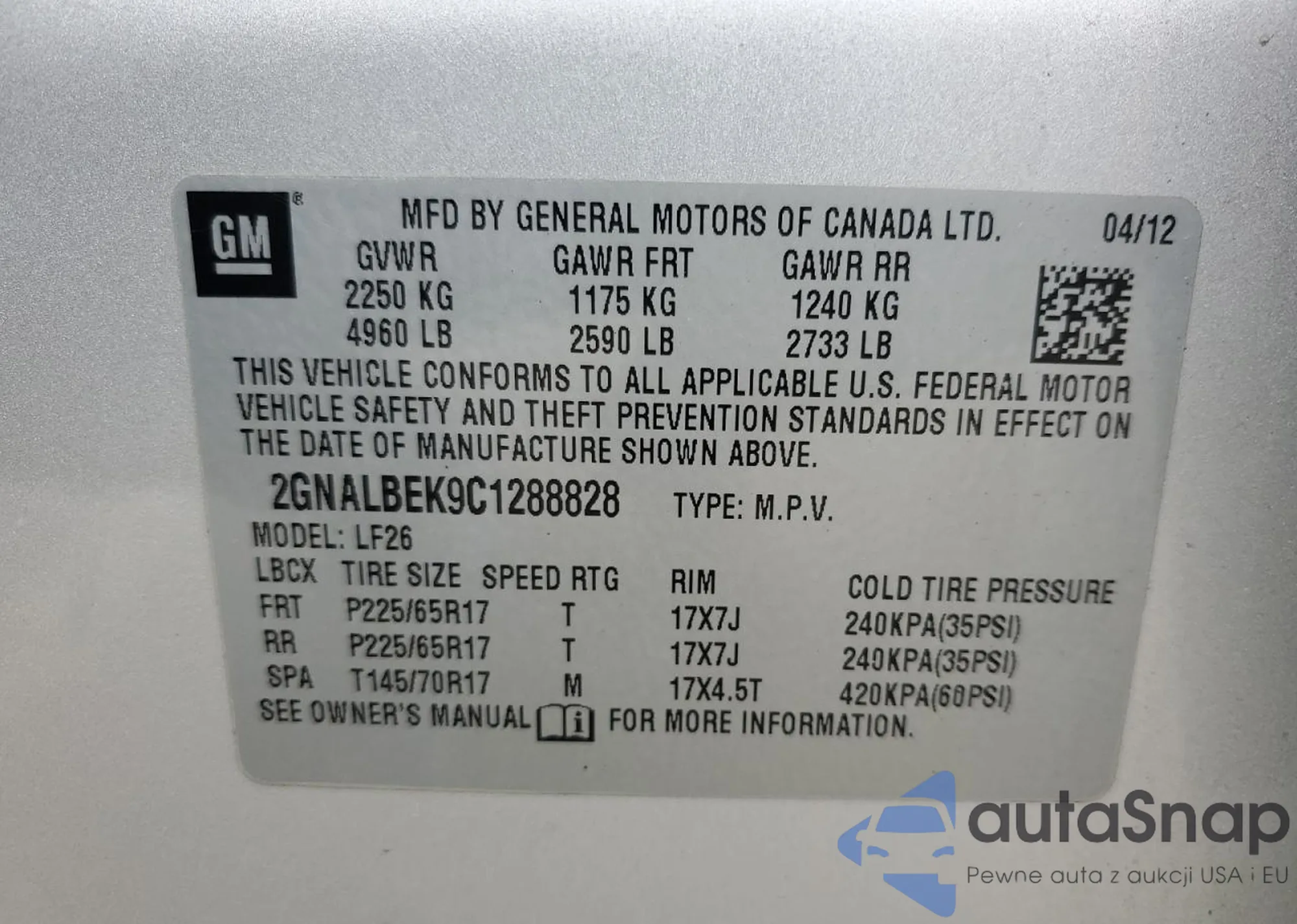 • VIN 2GNALBEK9C1288828