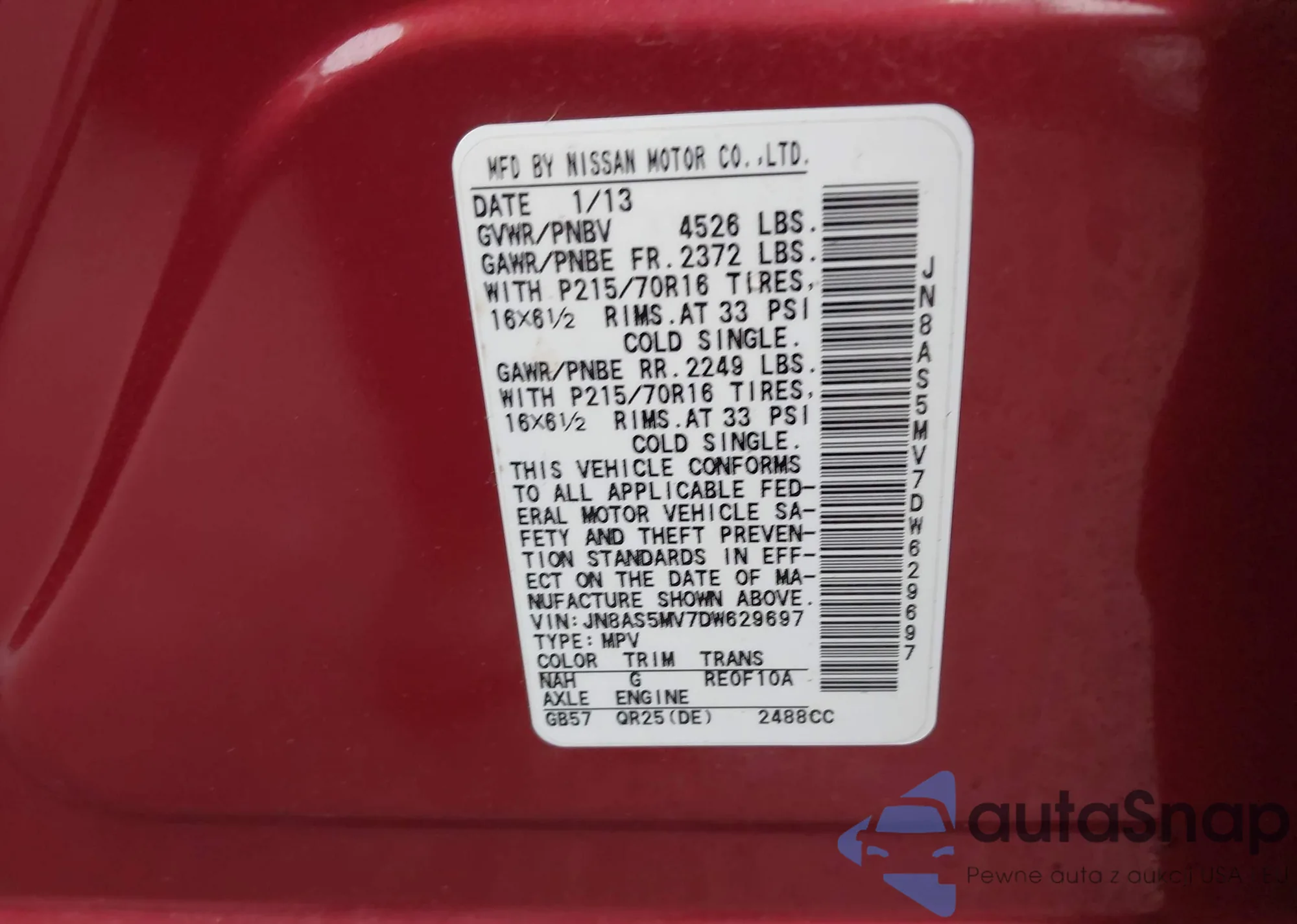 • VIN JN8AS5MV7DW629697