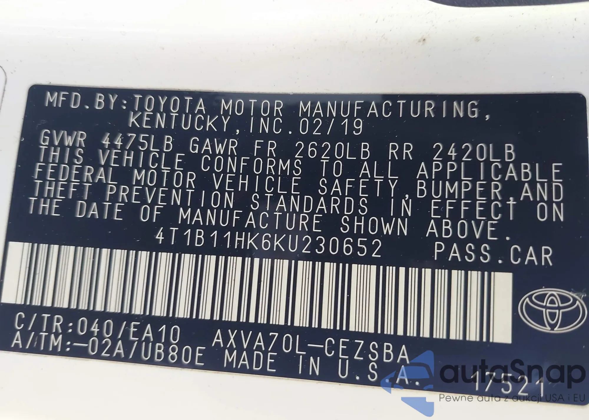 • VIN 4T1B11HK6KU230652