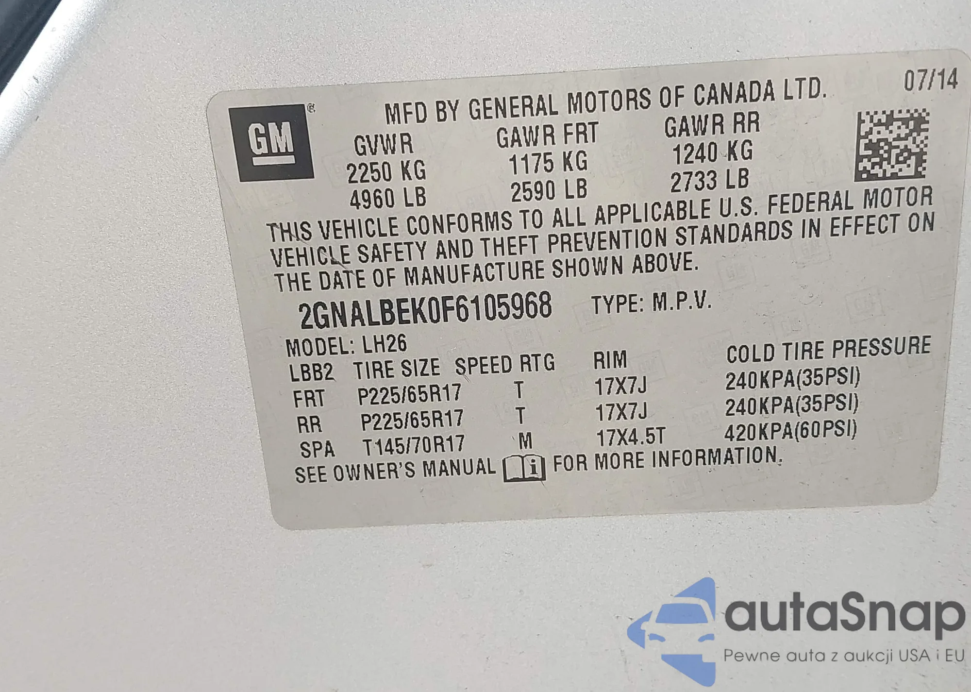• VIN KL47LCE20RB034016