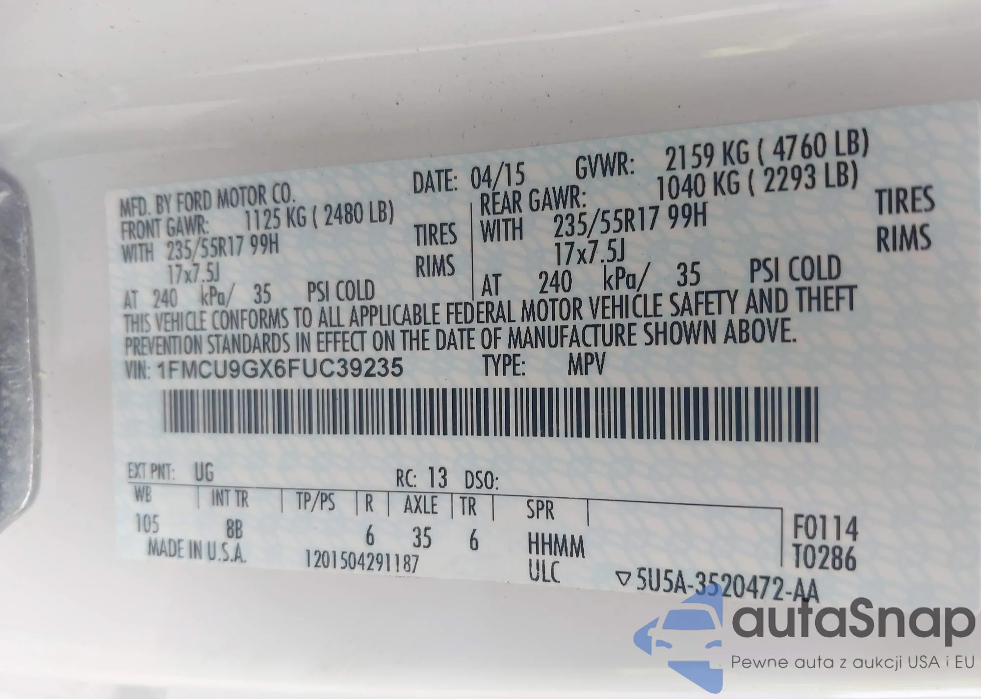 LOT: 42622290 VIN: KM8SM4HF1FU101204