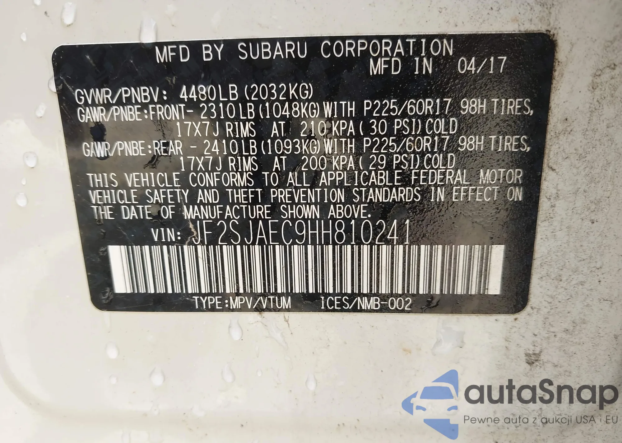 LOT: 42145013 VIN: JF2SJAEC9HH810241