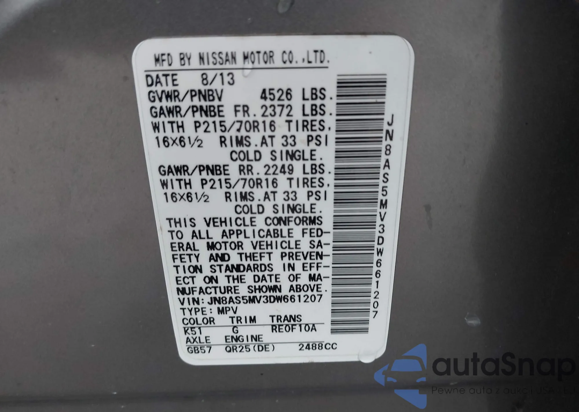 LOT: 42239745 VIN: 5N1AT3AB9MC750235