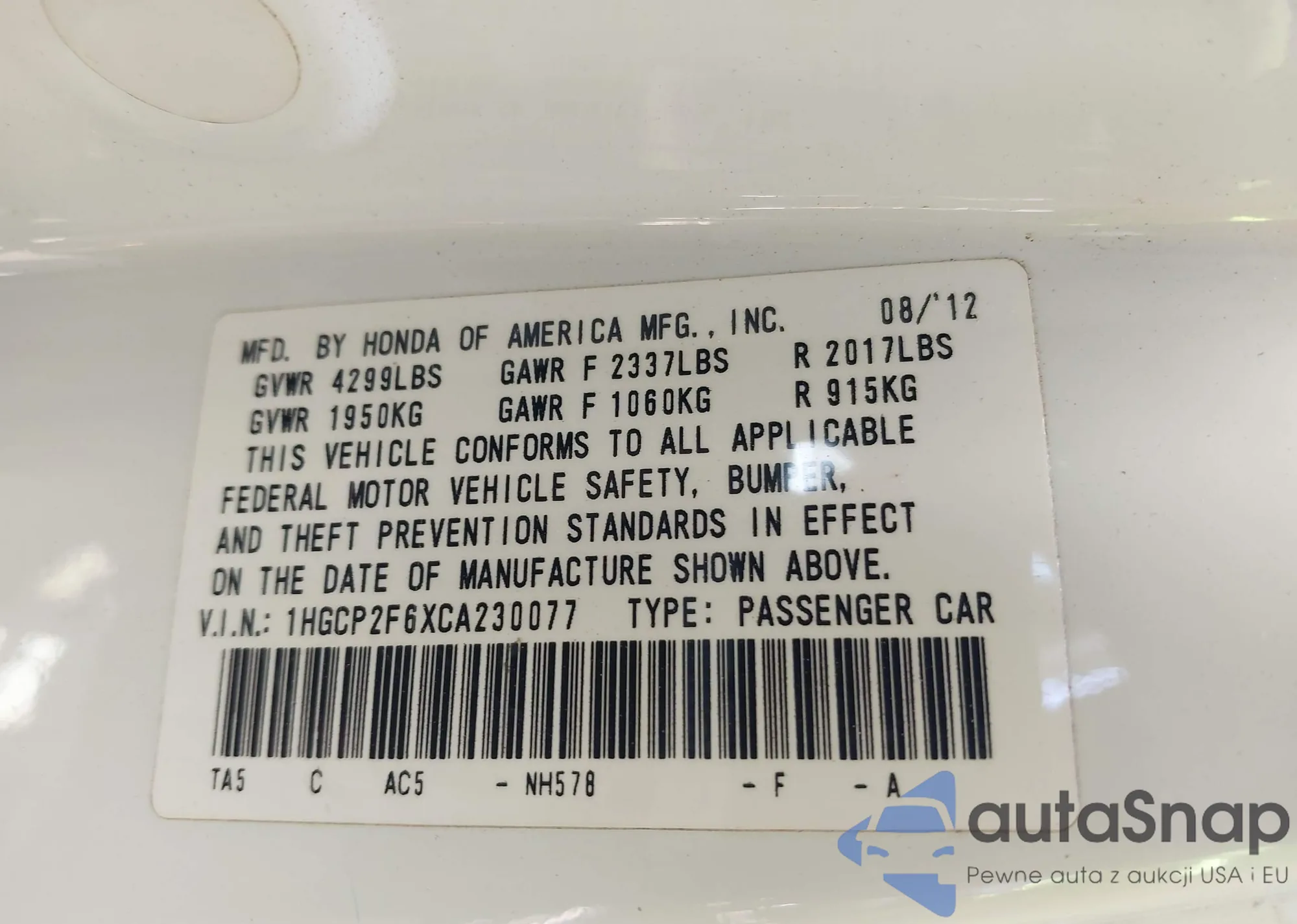 LOT: 42475077 VIN: 1HGCP2F79CA069844