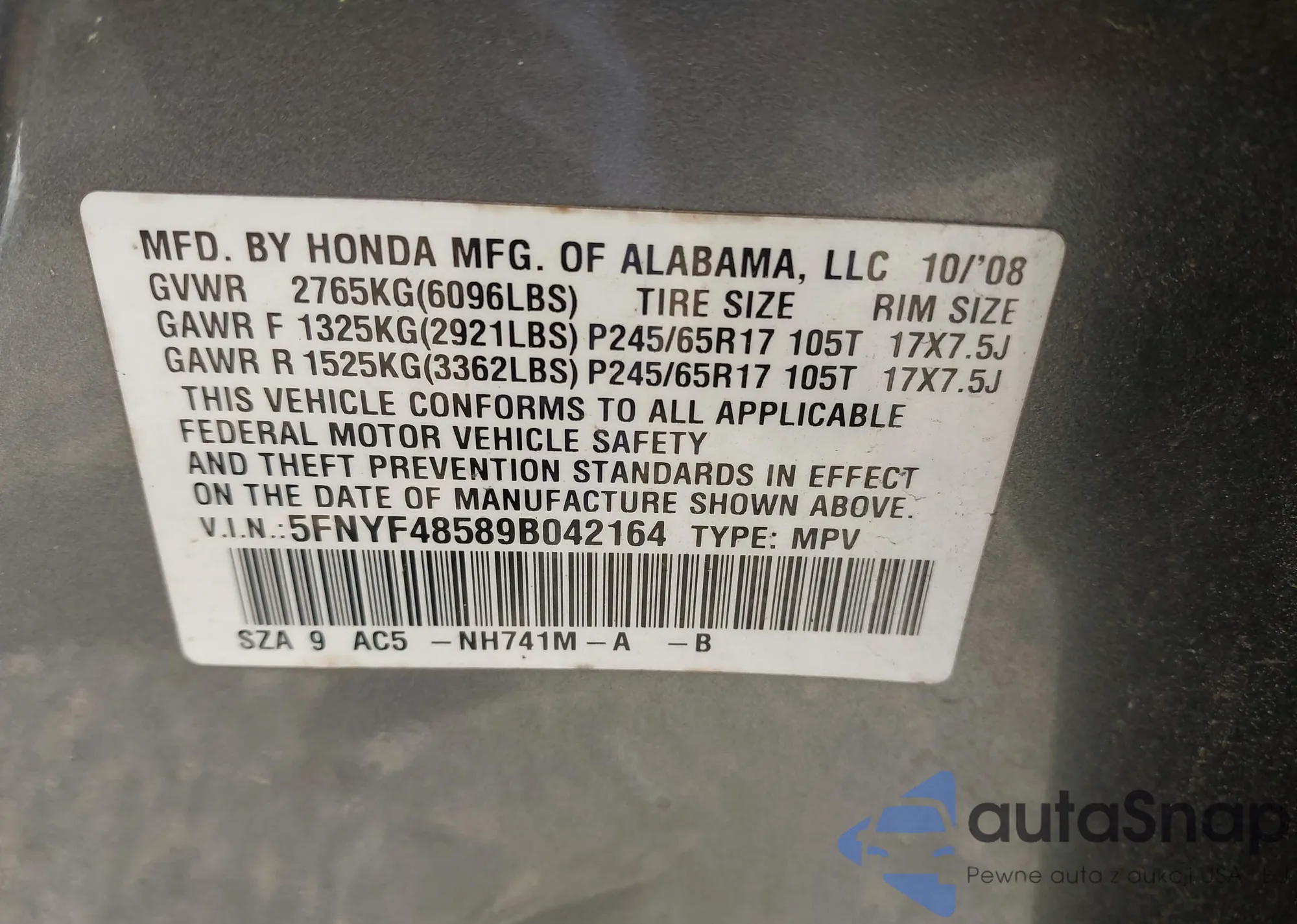 • VIN 5FNRL5H64FB013820