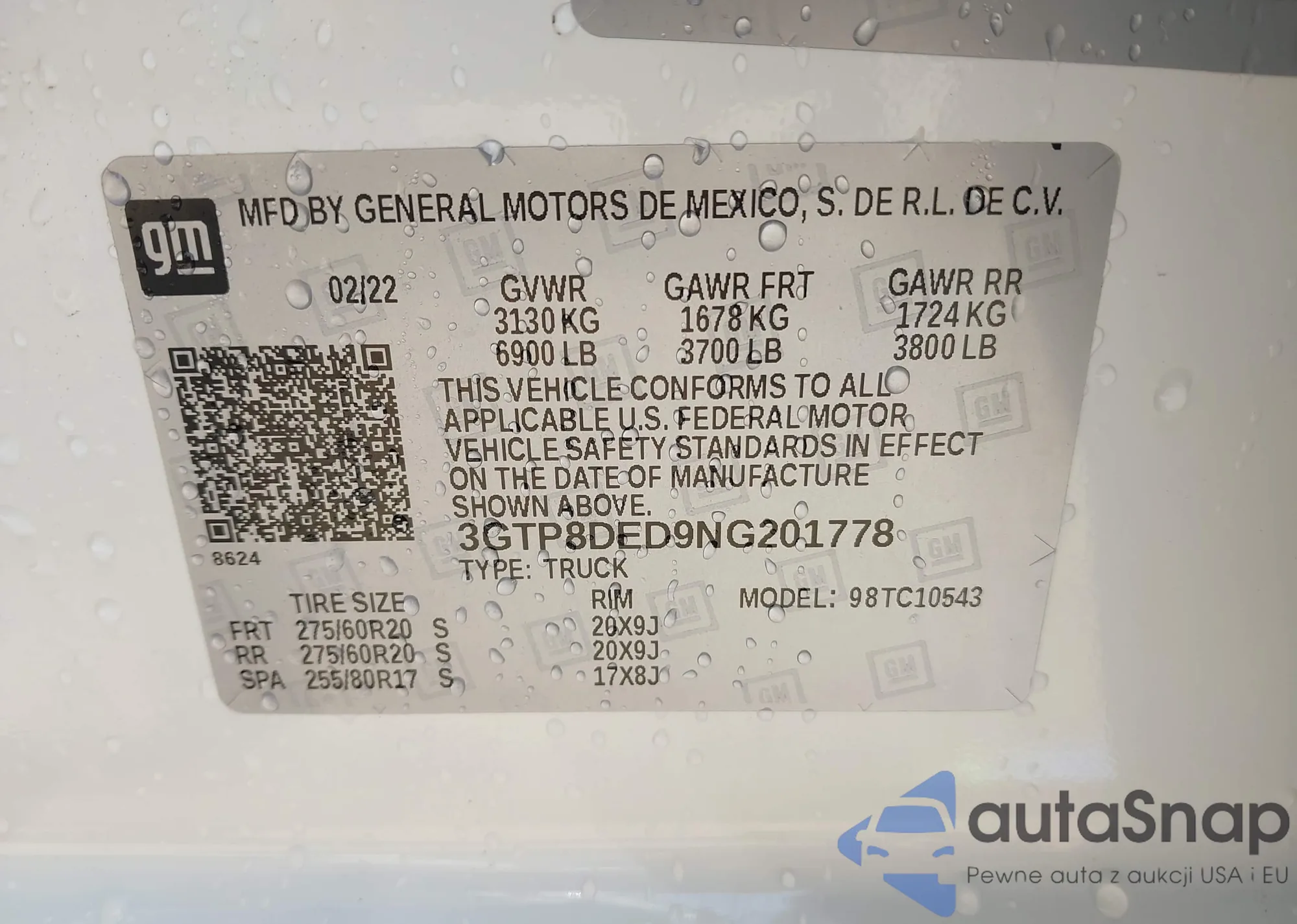 • VIN 3GTP8DED9NG201778