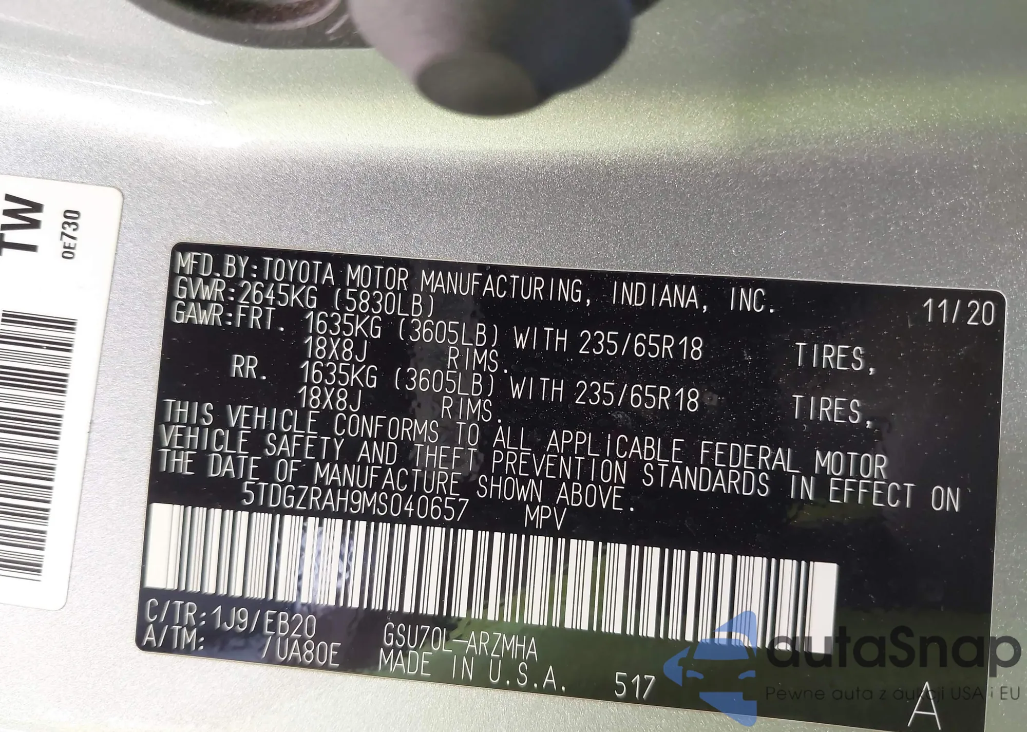 LOT: 42459519 VIN: 5TDGZRAH9MS040657
