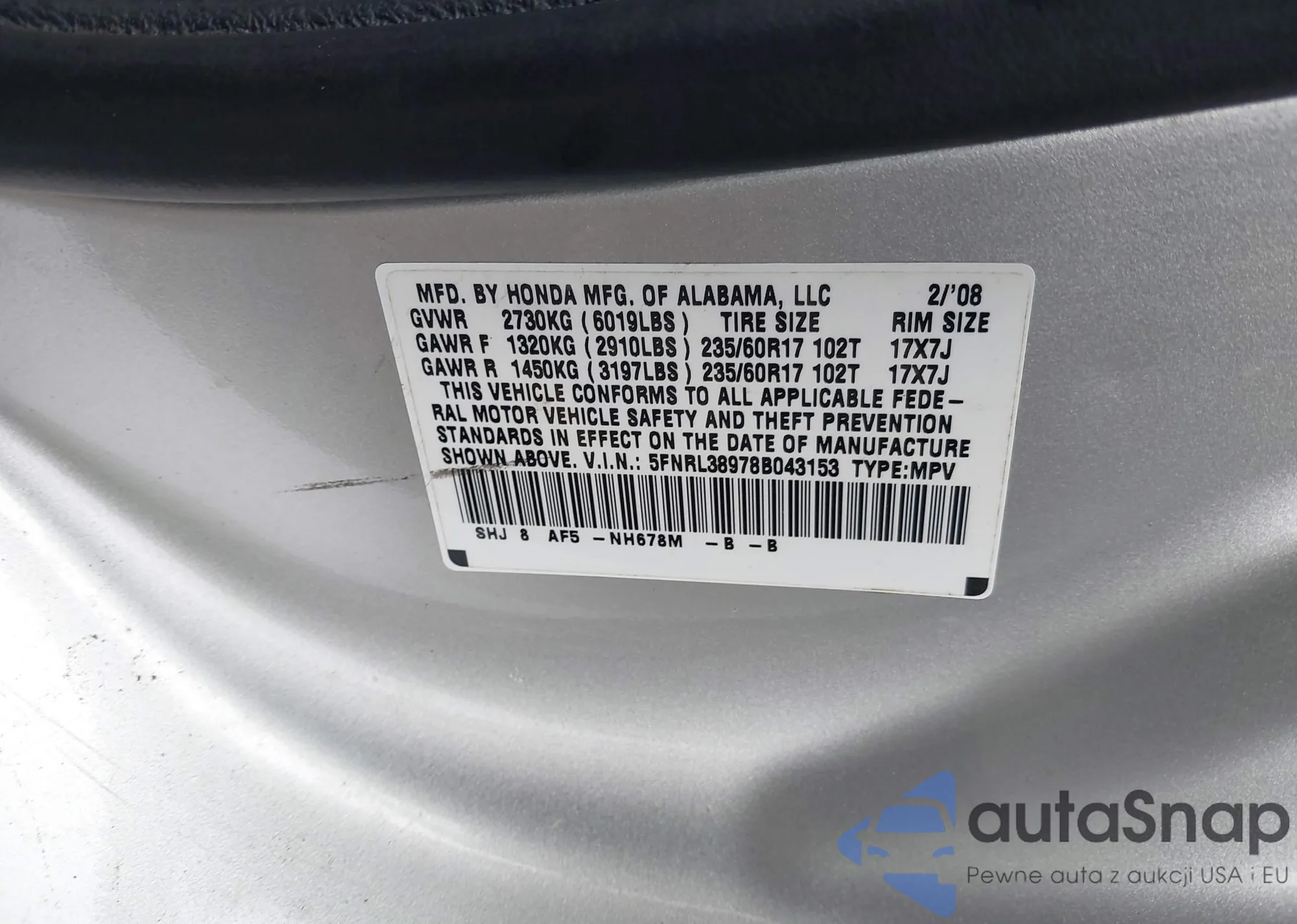 • VIN 5FNRL38978B043153