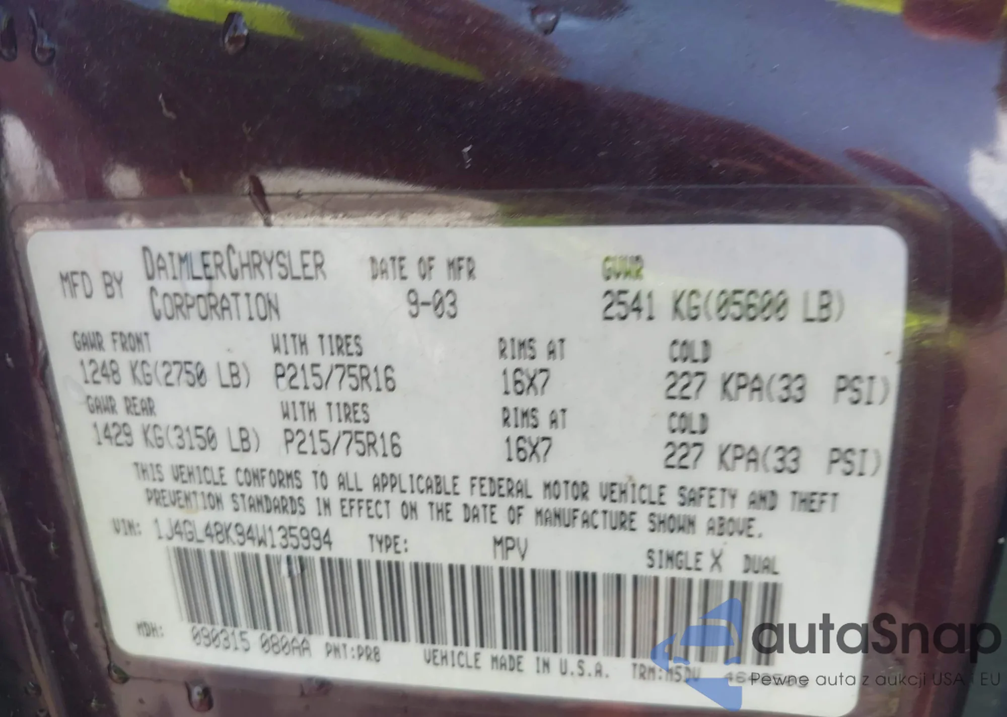 LOT: 42566280 VIN: 1J4GL48K94W135994