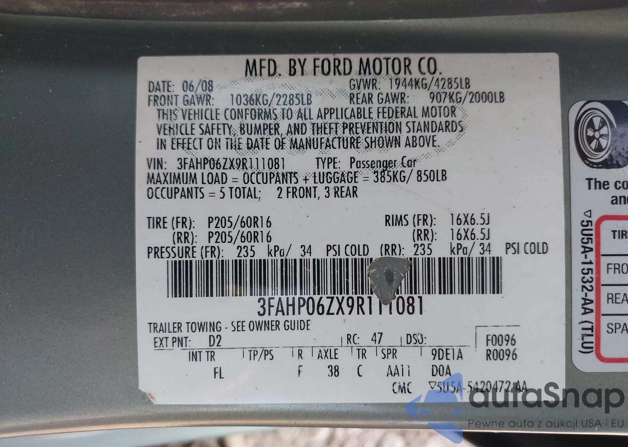 • VIN 3FAHP0JA4CR388480