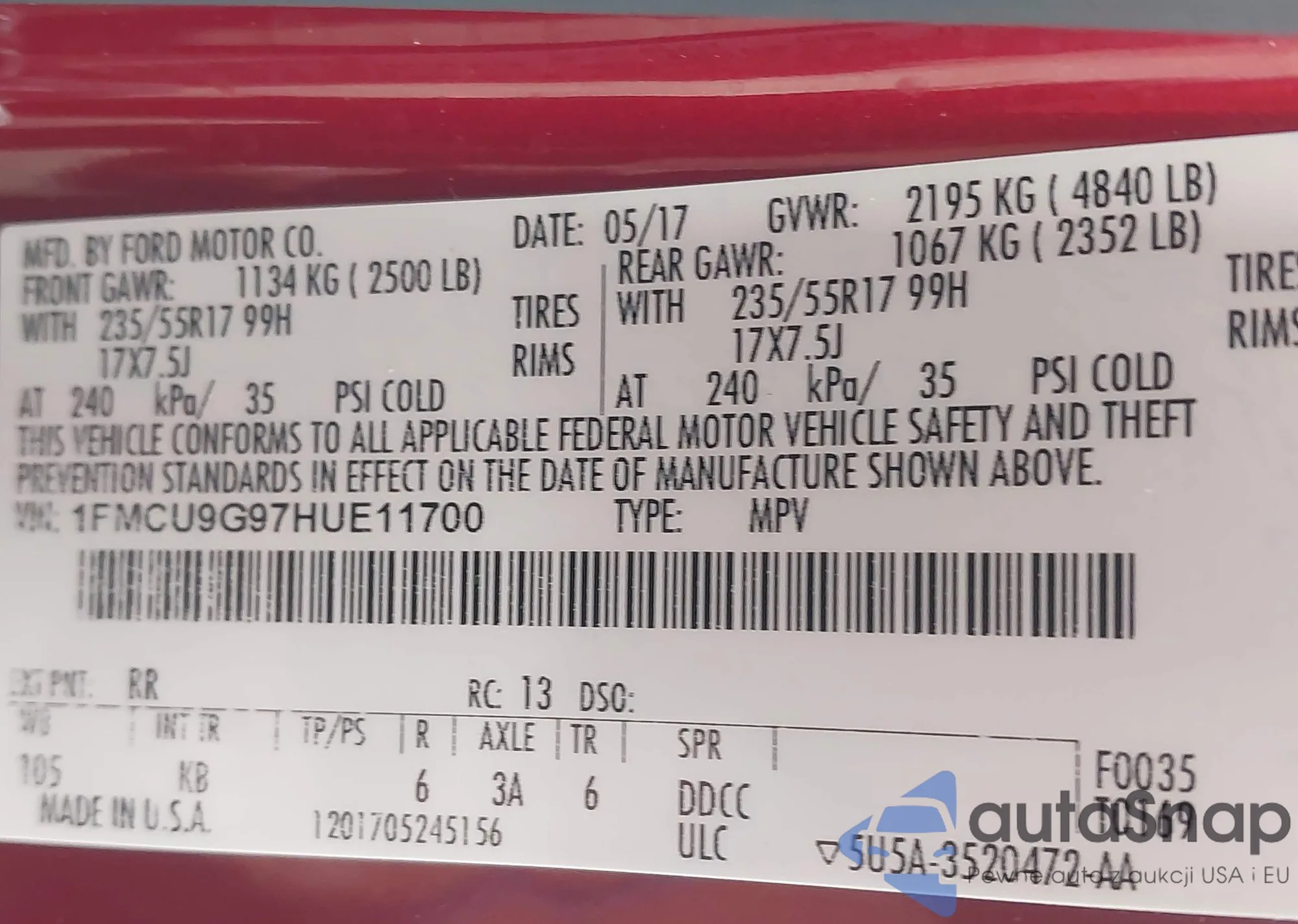 • VIN 1FMCU9G97HUE11700