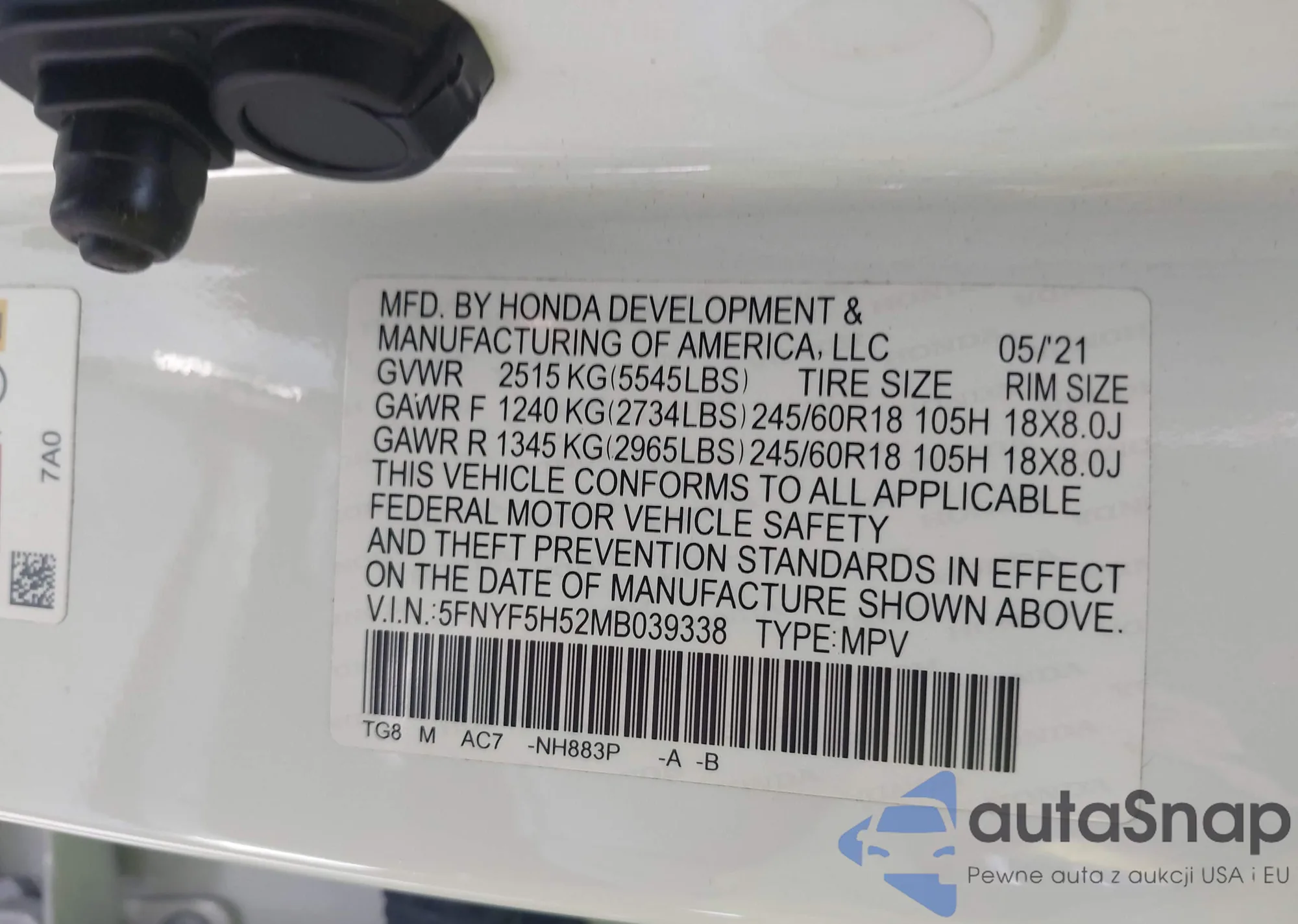 • VIN 5FNYF5H52MB039338