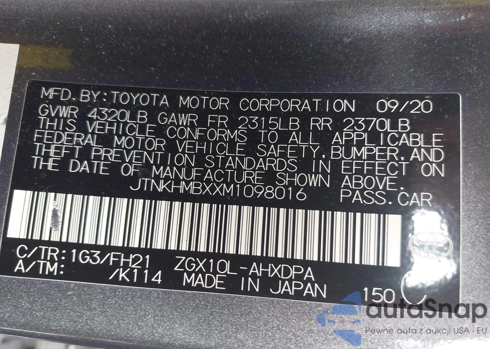 LOT: 42430140 VIN: JTNKHMBXXM1098016
