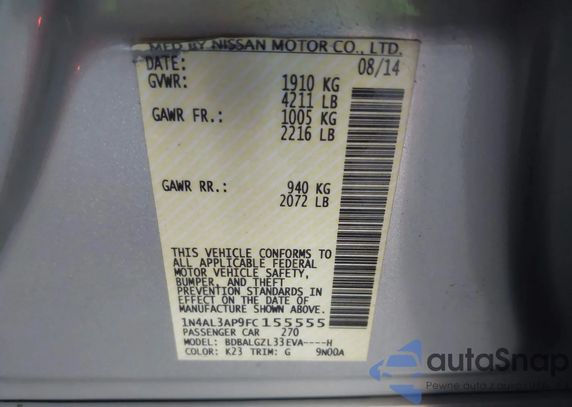 LOT: 42530175 VIN: 1N4AL3AP9FC155555