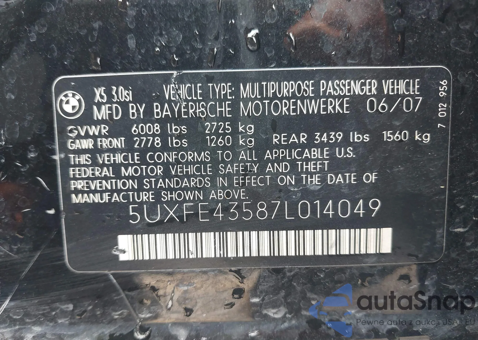 2007 BMW X5 3.0Si from USA, damaged, VIN 5UXFE43587L014049