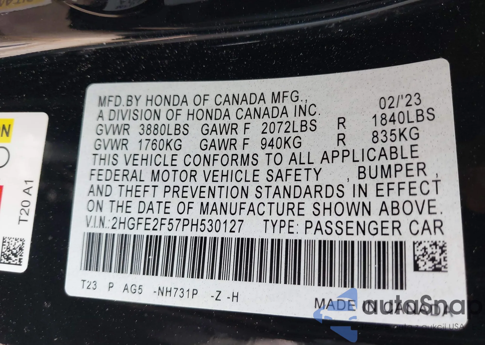 • VIN 2HGFE2F57PH530127