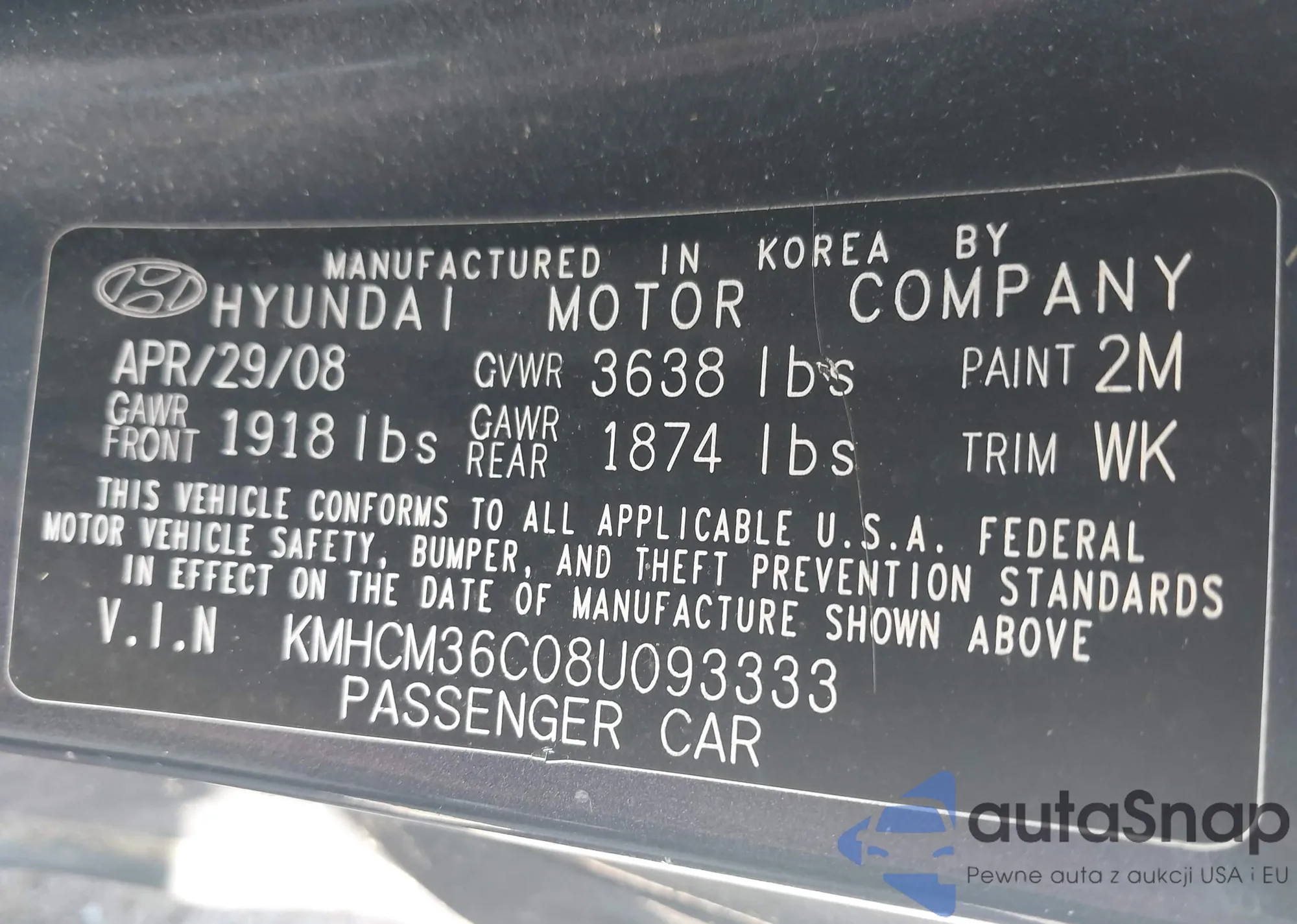 LOT: 42265375 VIN: KMHCM36C08U093333