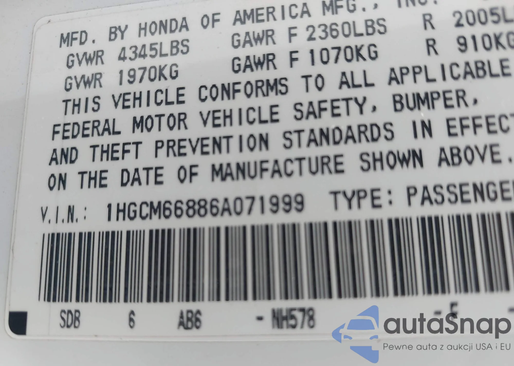 LOT: 42288137 VIN: 1HGCM66886A071999