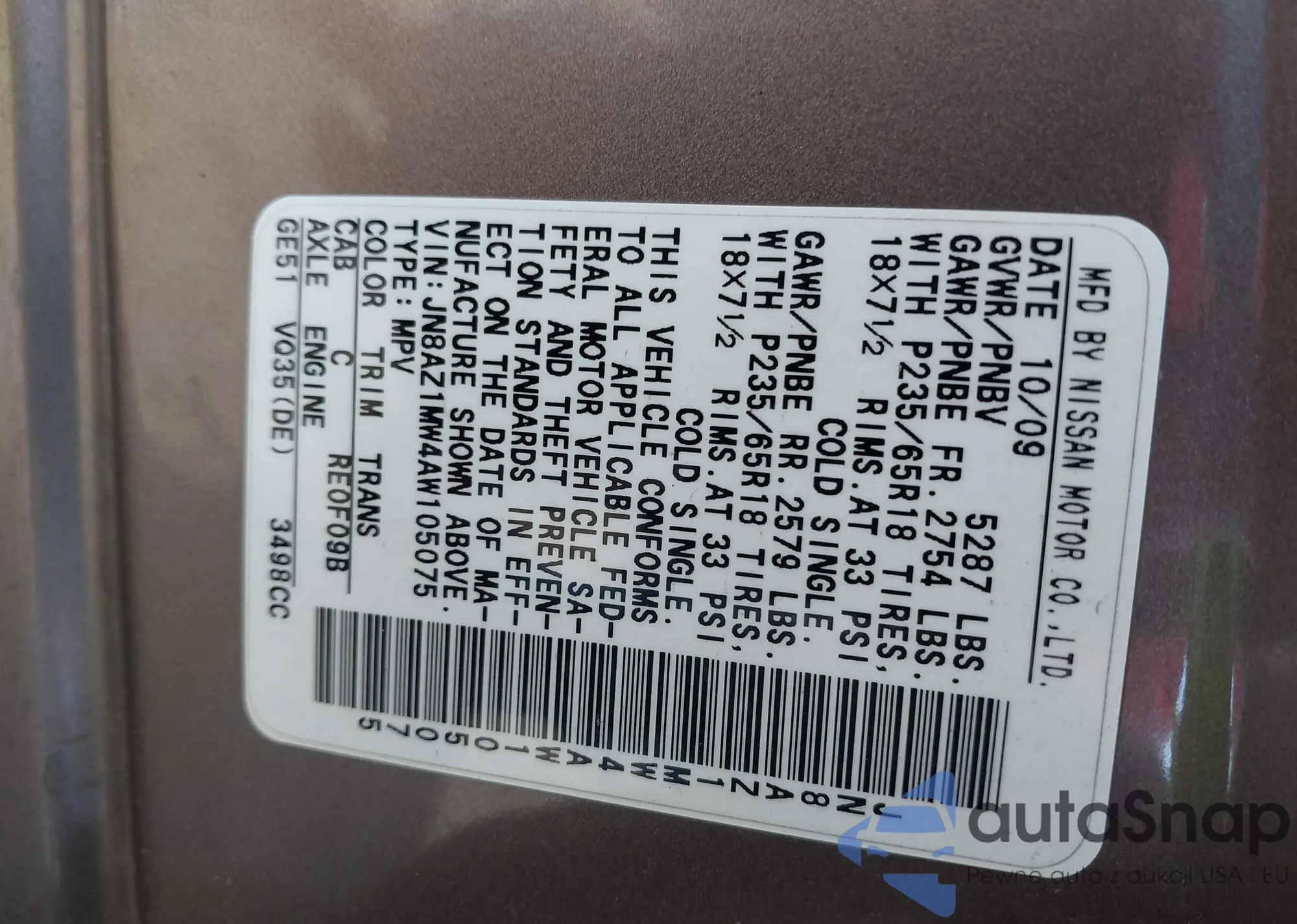 • VIN 1HGCP2F82CA169941