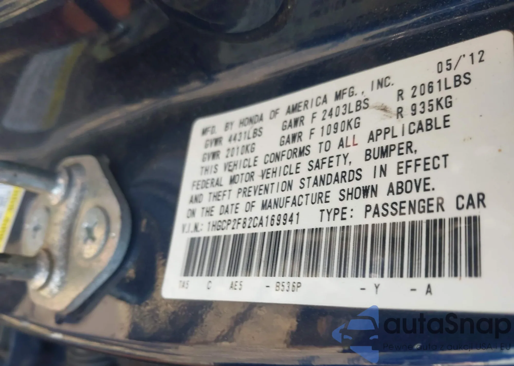 LOT: 42173561 VIN: 1HGCP2F82CA169941
