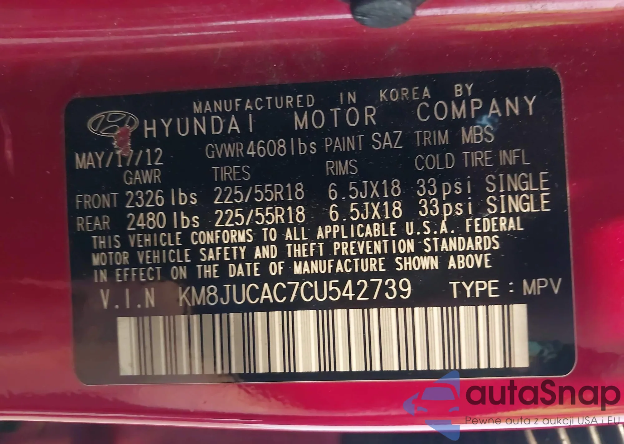 • VIN KM8JUCAC7CU542739