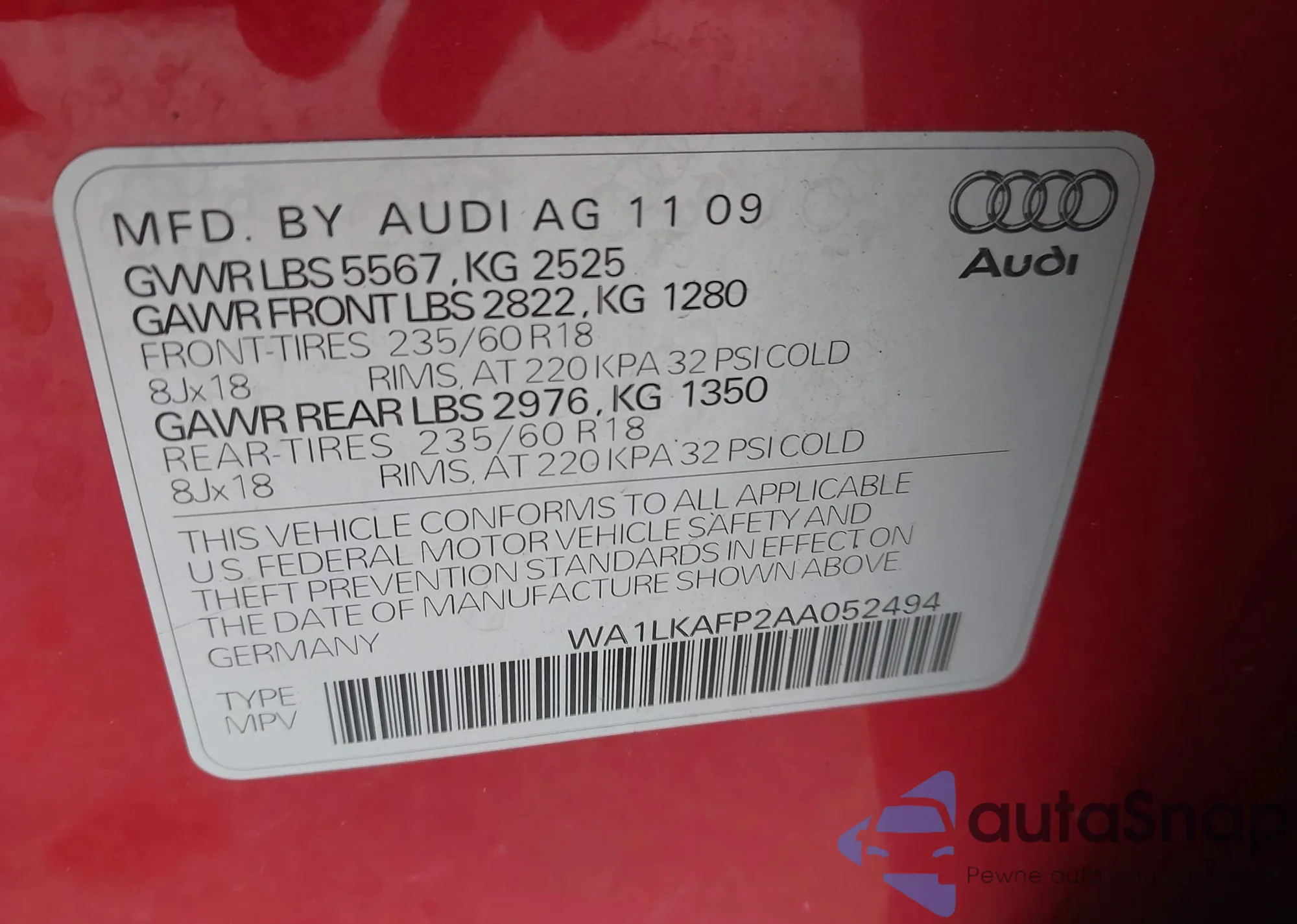 LOT: 42443407 VIN: WA1LKAFP2AA052494