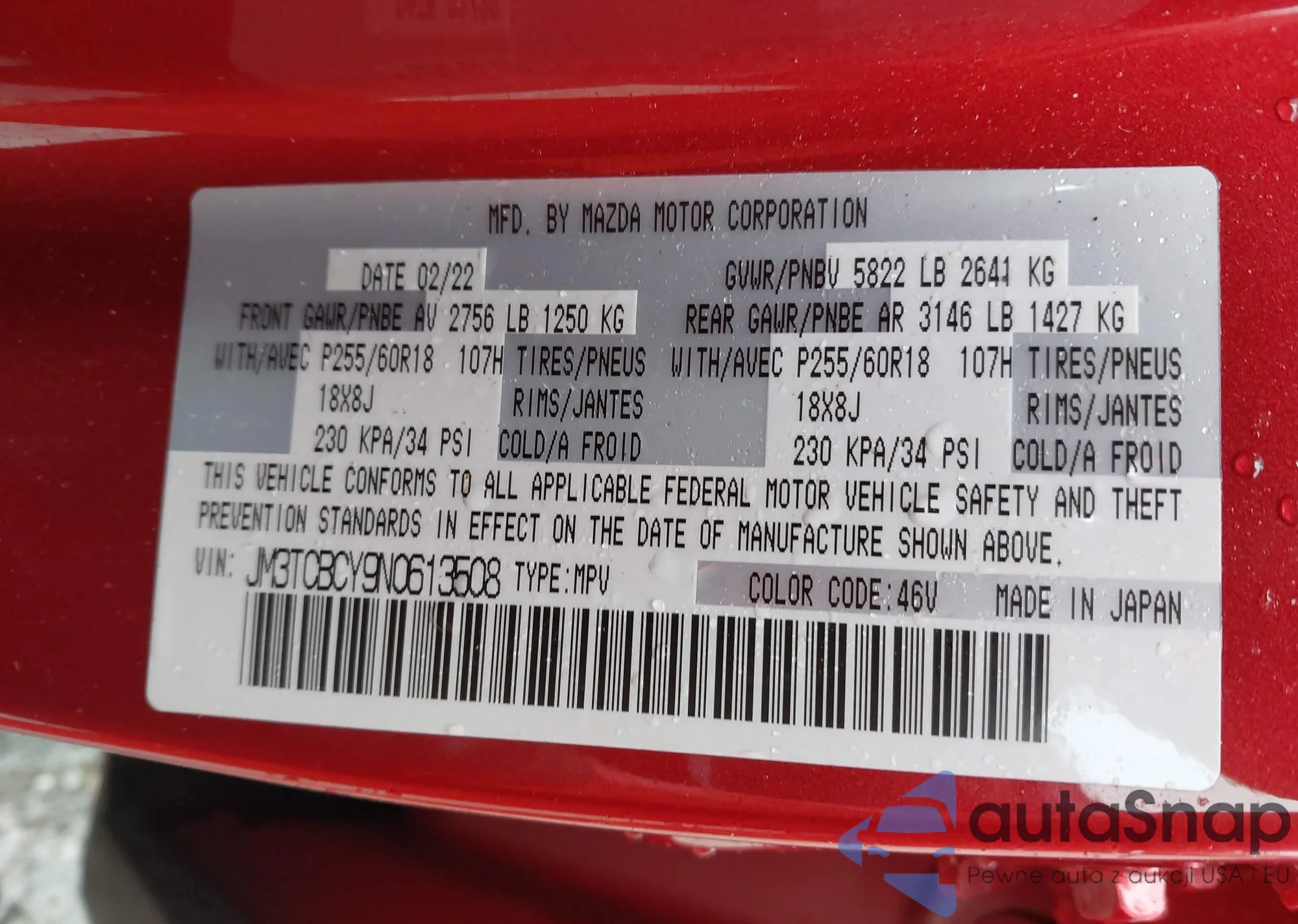 LOT: 42258870 VIN: JM3TCBCY9N0613508