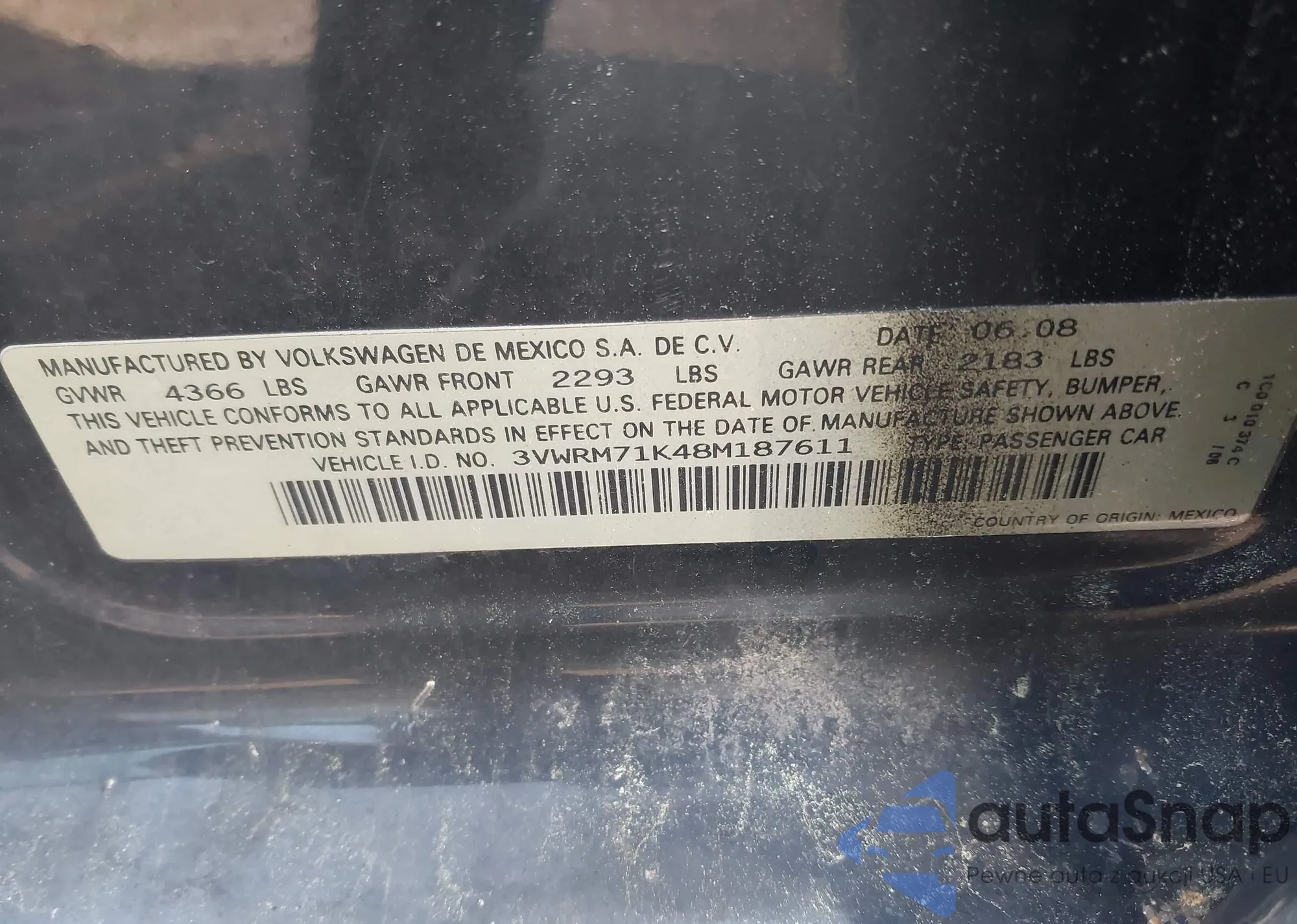 • VIN 3VWRM71K48M187611