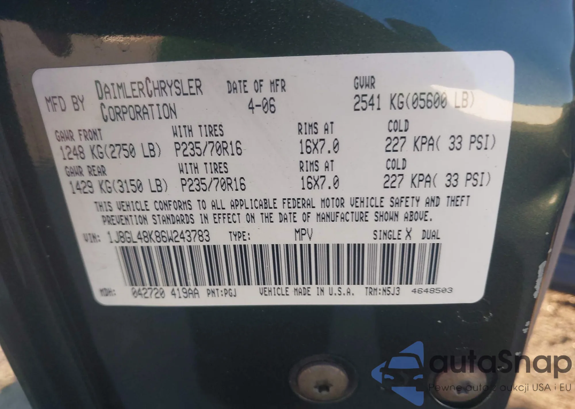 • VIN 1J8GL48K86W243783