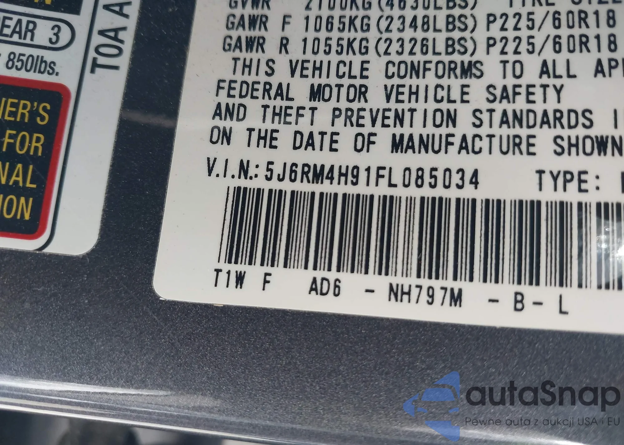 • VIN 5J6RM4H91FL085034