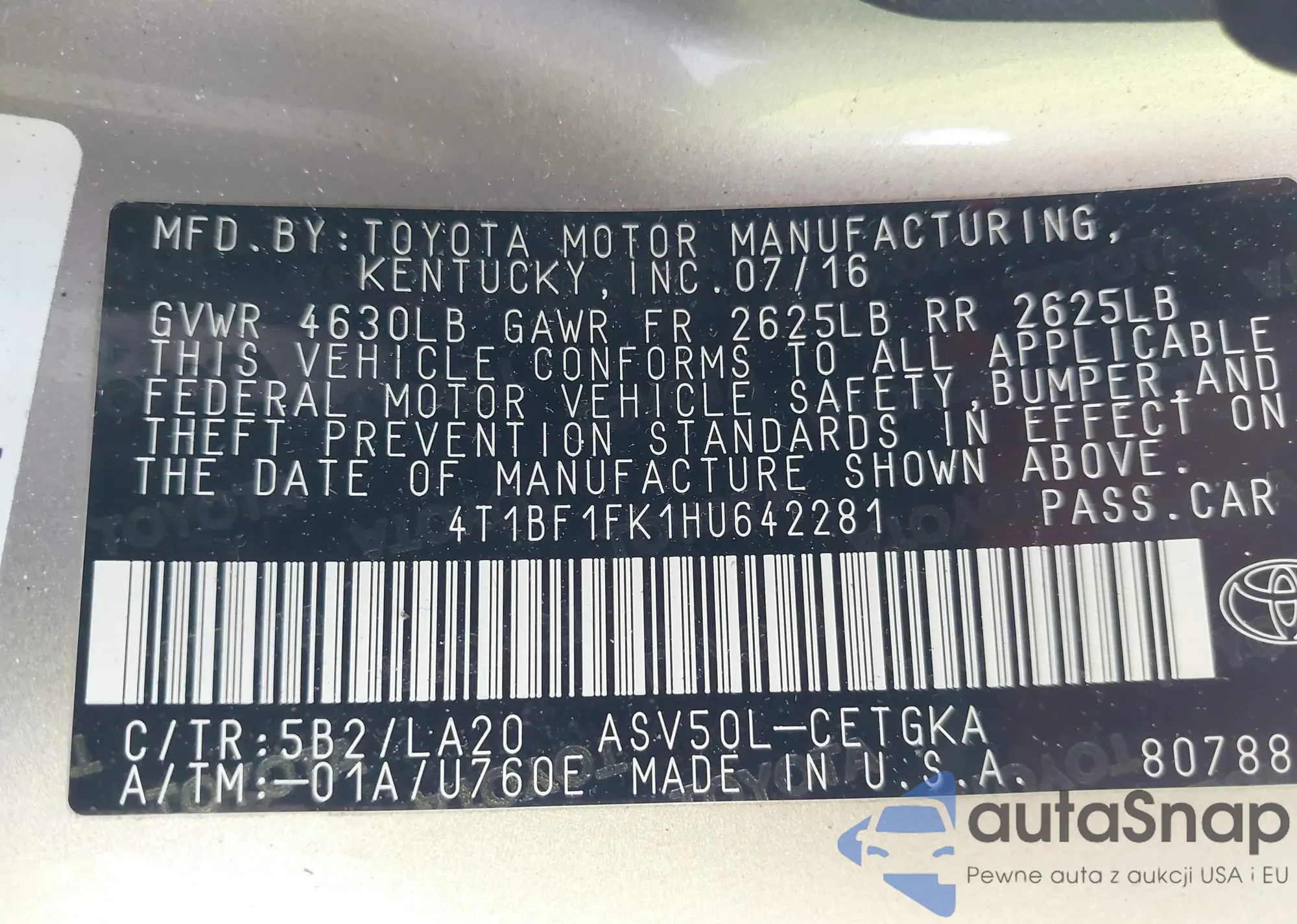 • VIN 4T1BF1FK1HU642281