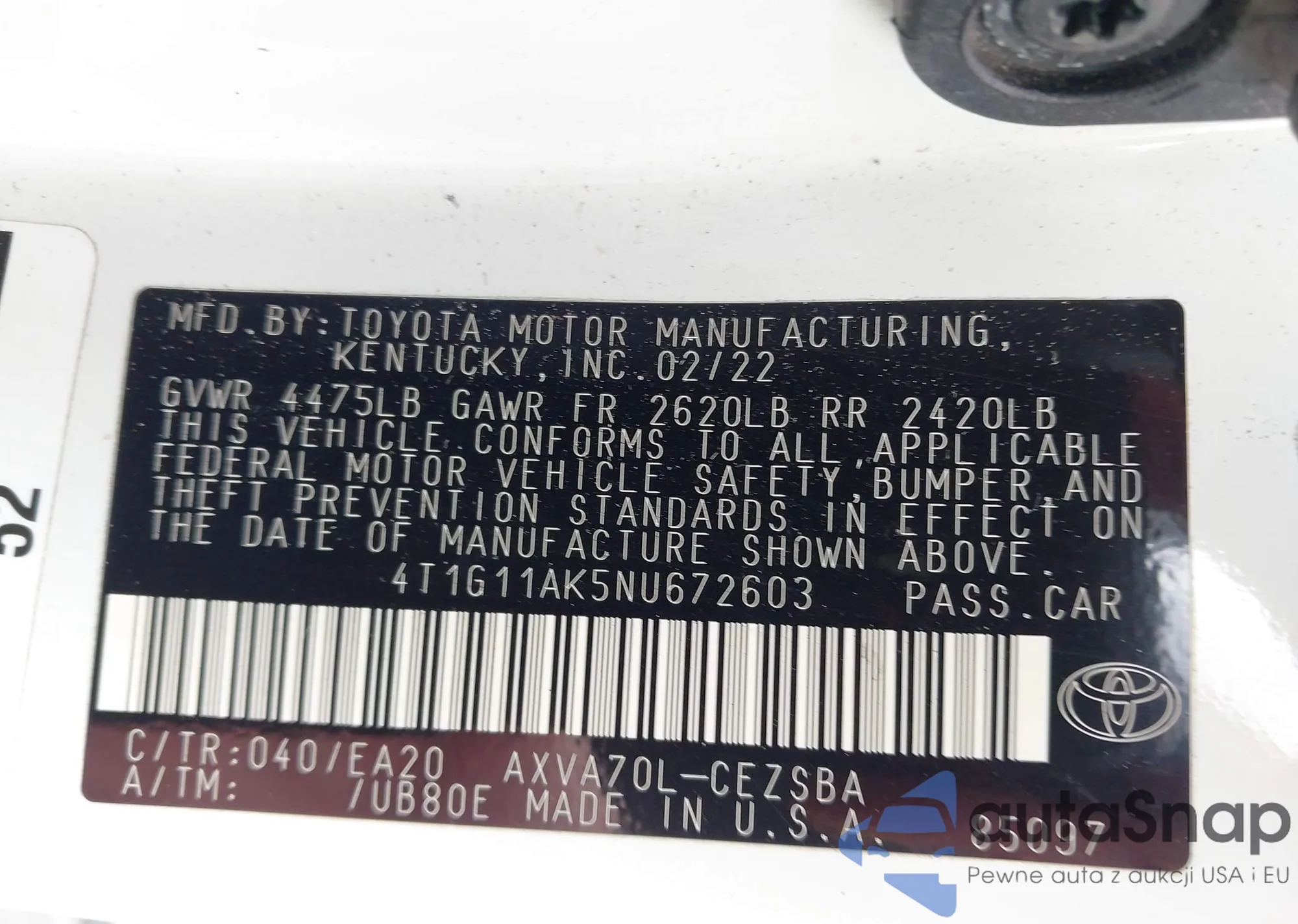 LOT: 42272927 VIN: 4T1G11AK5NU672603