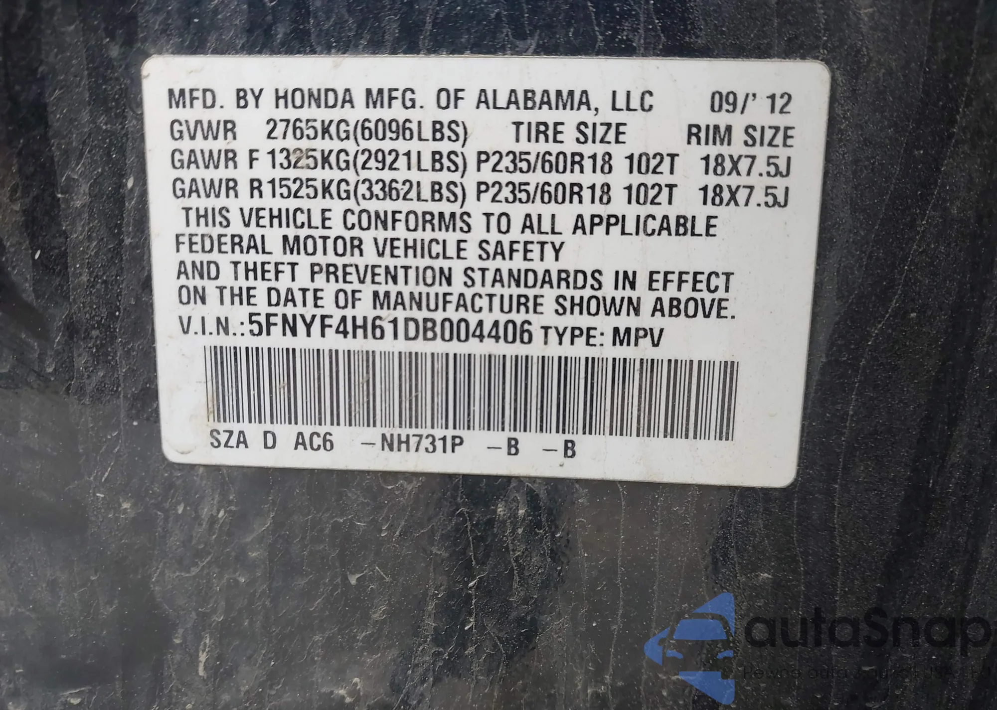 LOT: 42502780 VIN: 1HGCP26339A052950