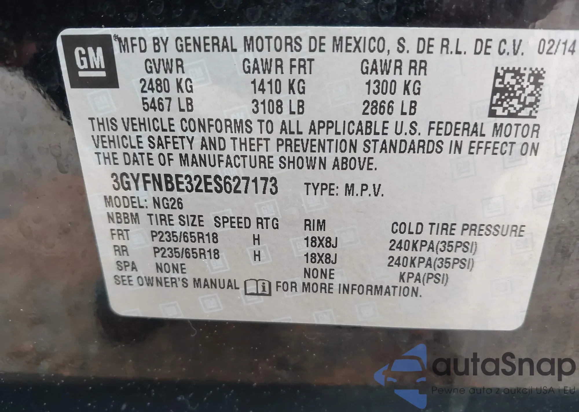 LOT: 42343353 VIN: 3GYFNBE32ES627173