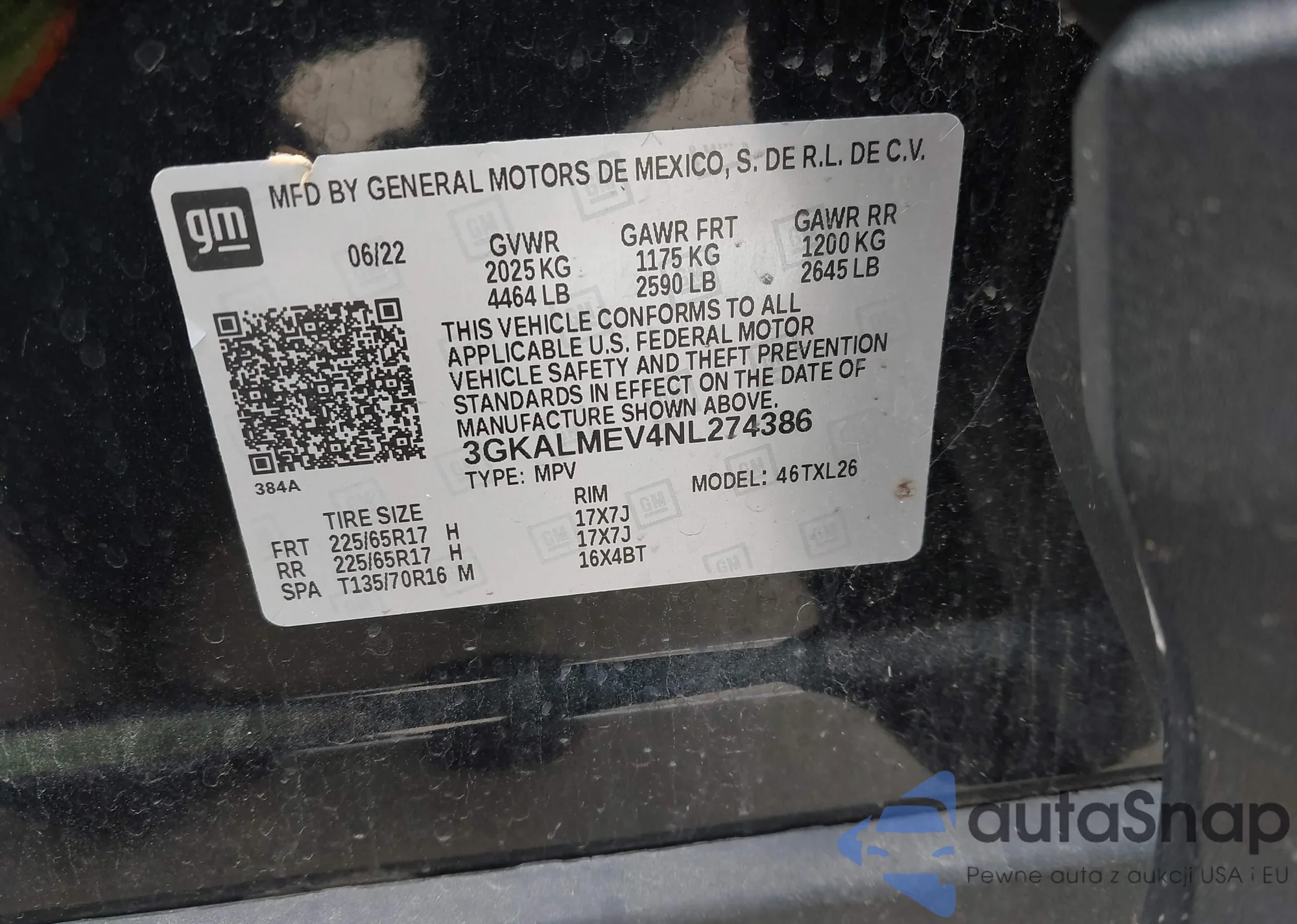 LOT: 42205178 VIN: 3GKALMEV4NL274386