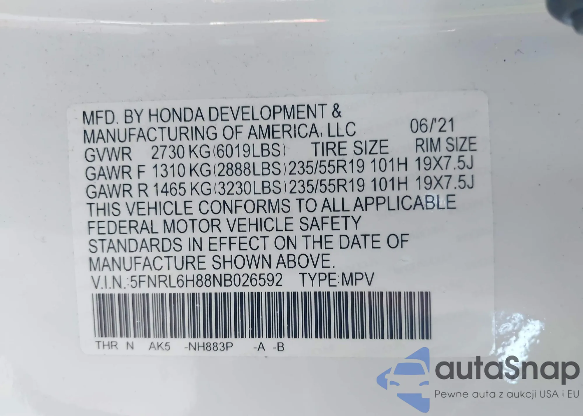 LOT: 42616172 VIN: 1HGCP2F36AA190194