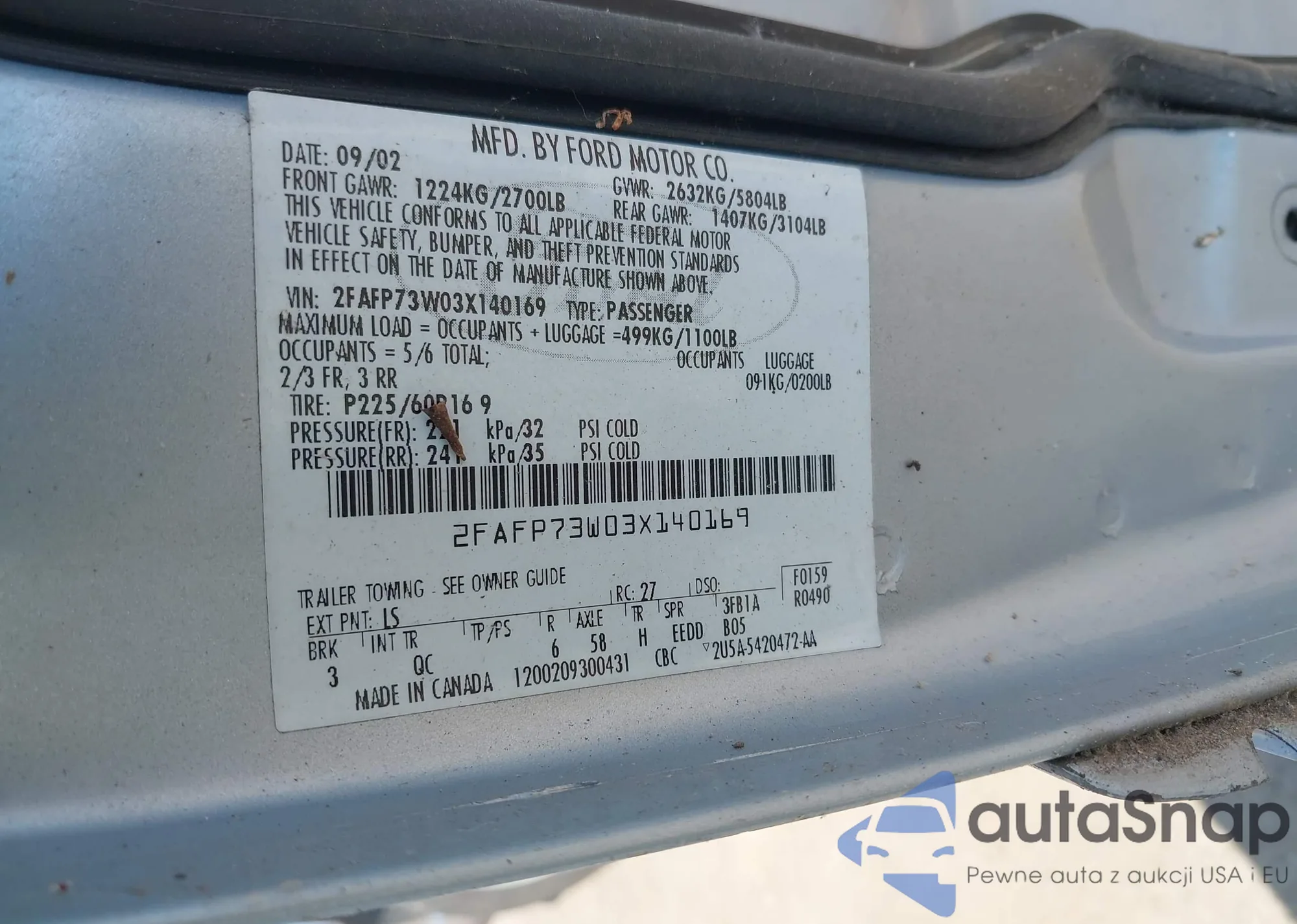 LOT: 42576325 VIN: 2FAFP73W03X140169