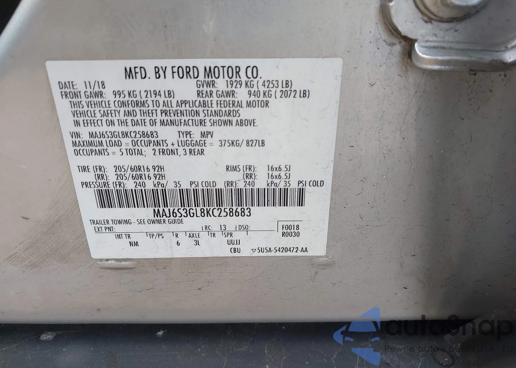 • VIN MAJ6S3GL8KC258683