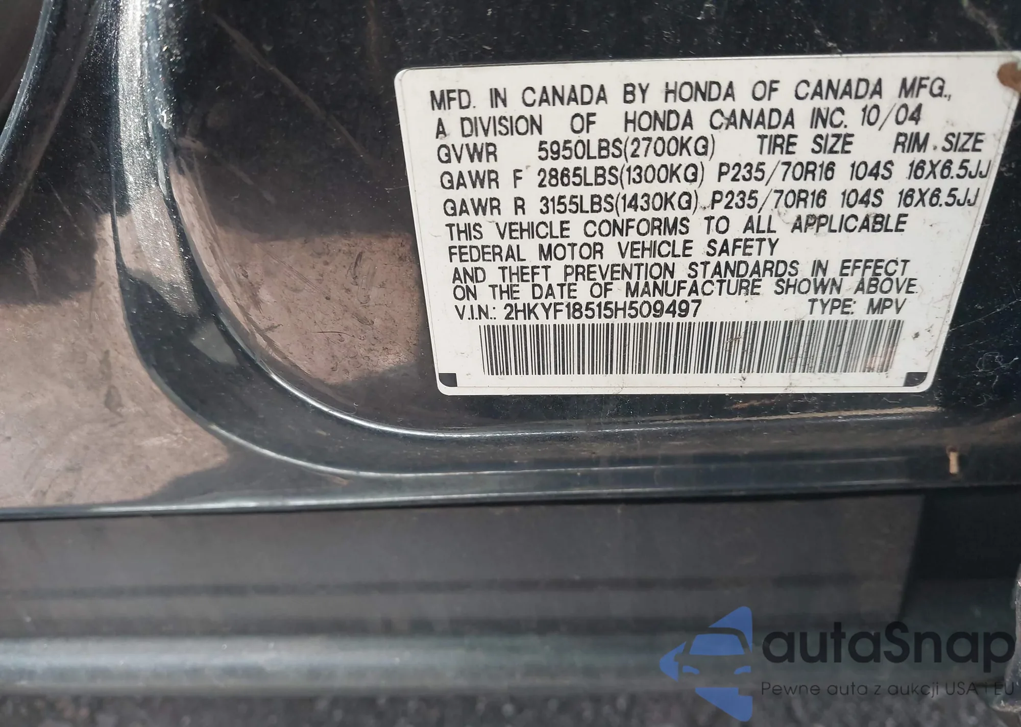 • VIN 5J6RE48339L065817