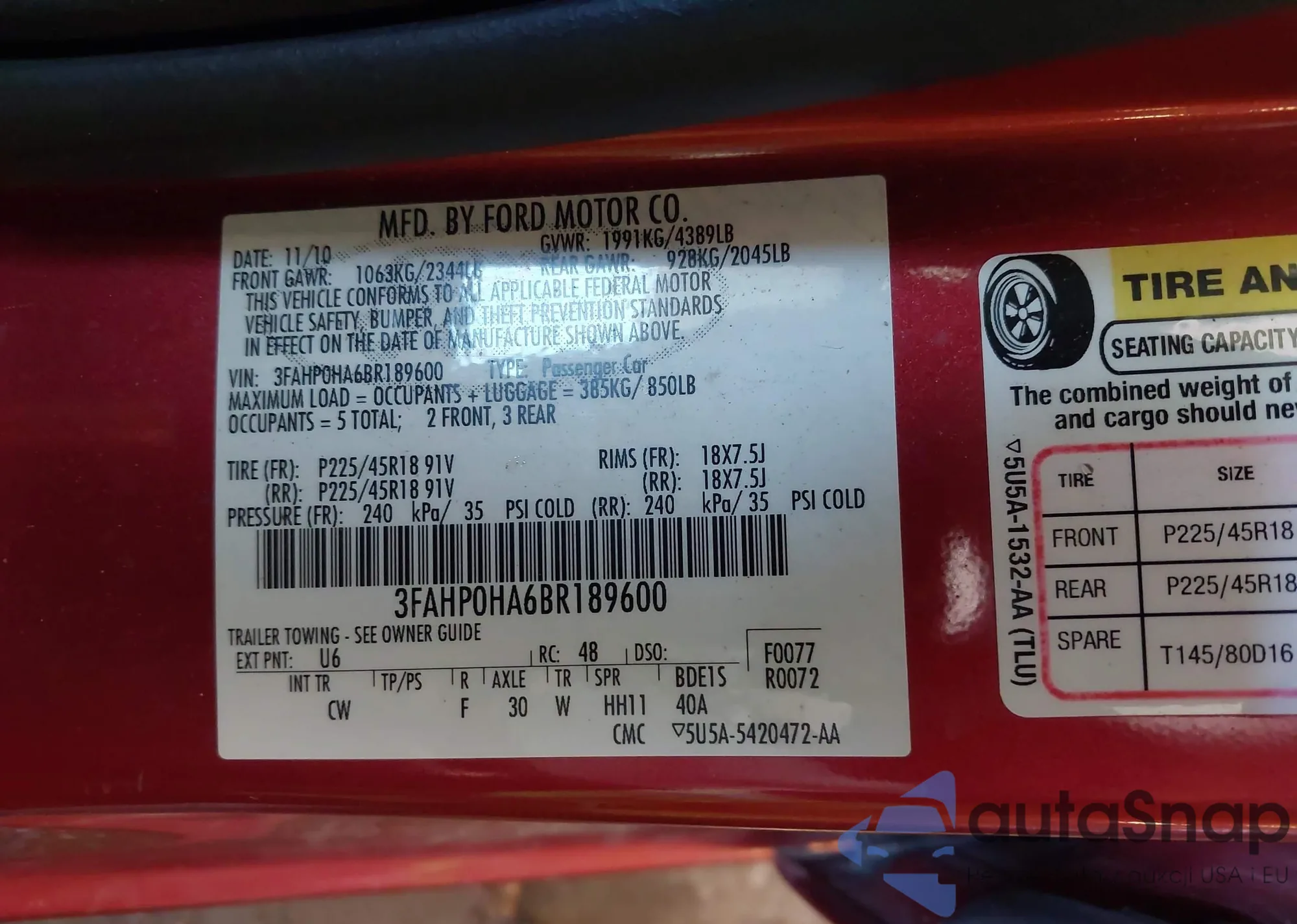 LOT: 42236775 VIN: 3FAHP0HA6BR189600