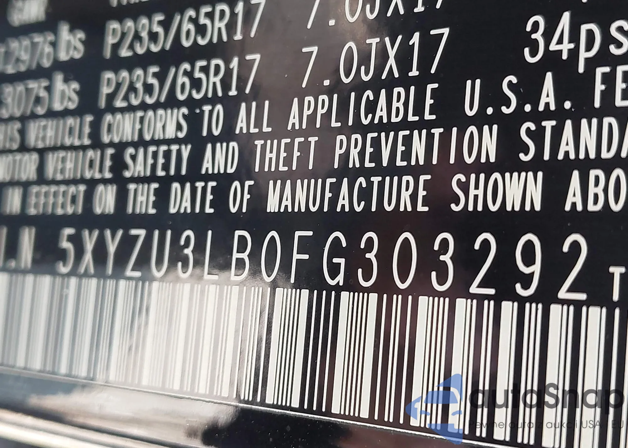 • VIN 5XYZU3LB0FG303292