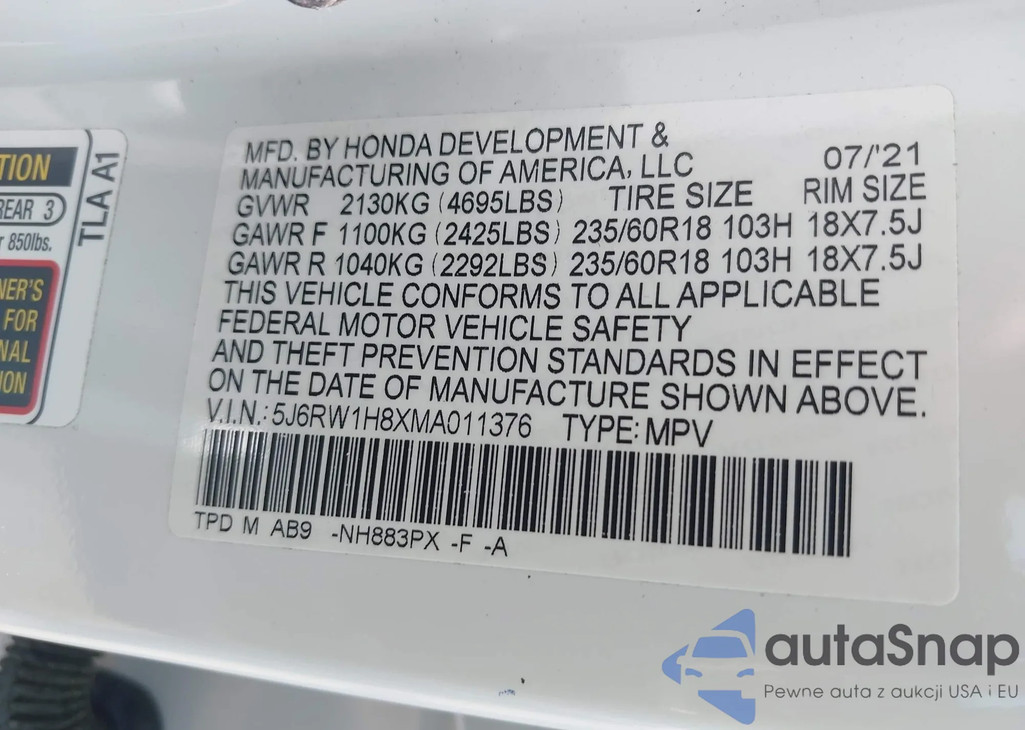 • VIN 5J6RW1H8XMA011376