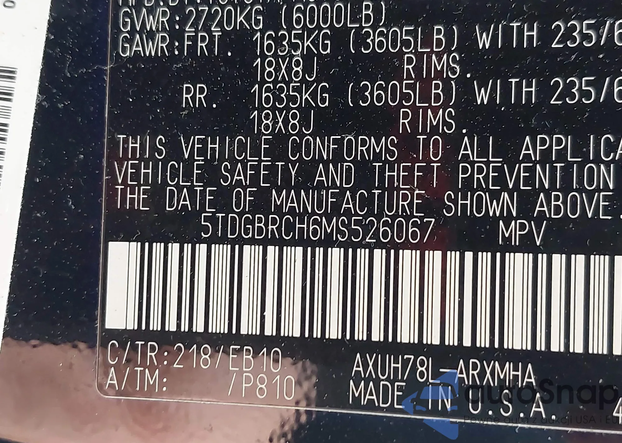 LOT: 42475631 VIN: 5TDGBRCH6MS526067