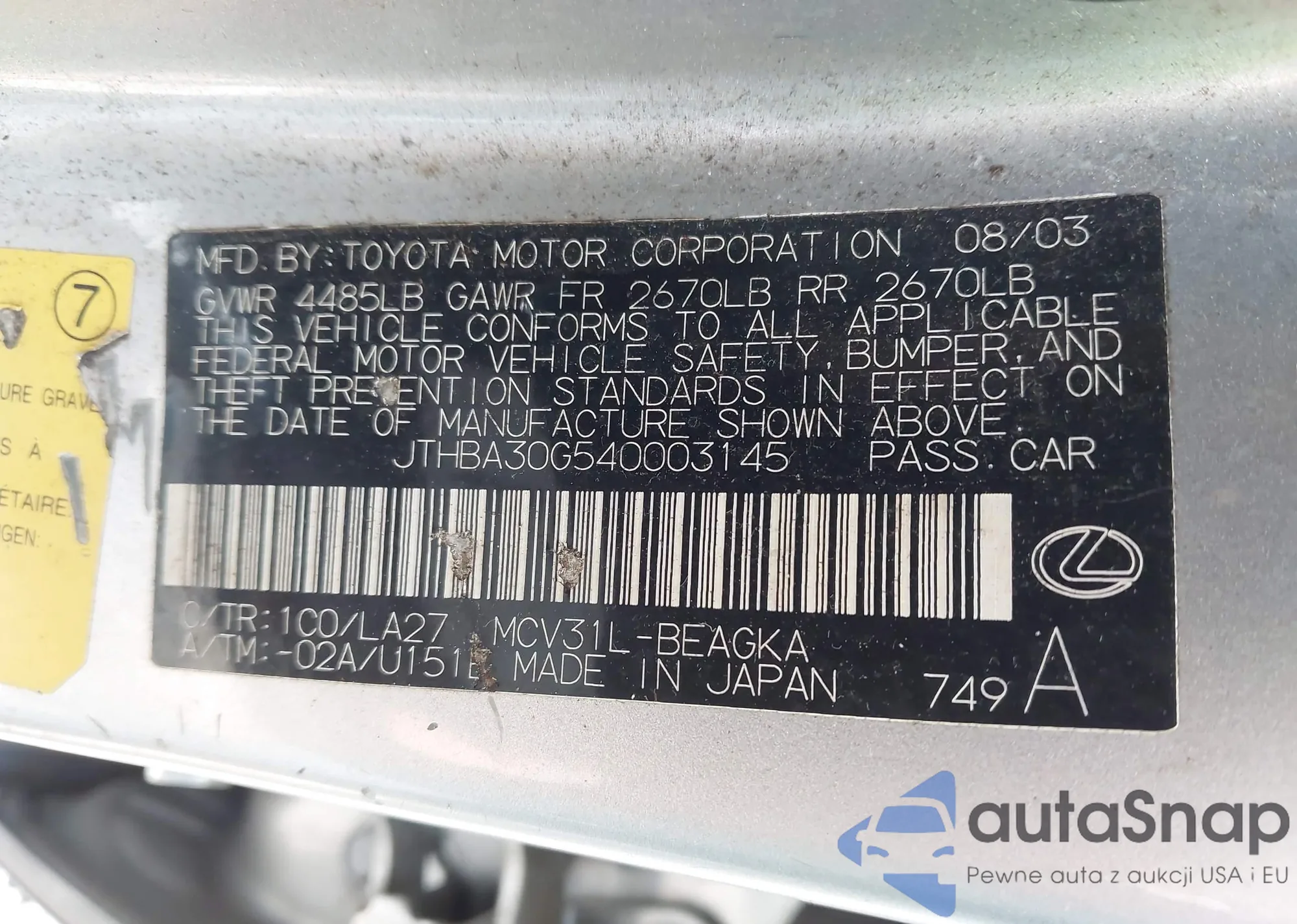 LOT: 42366764 VIN: JTHBA30G540003145