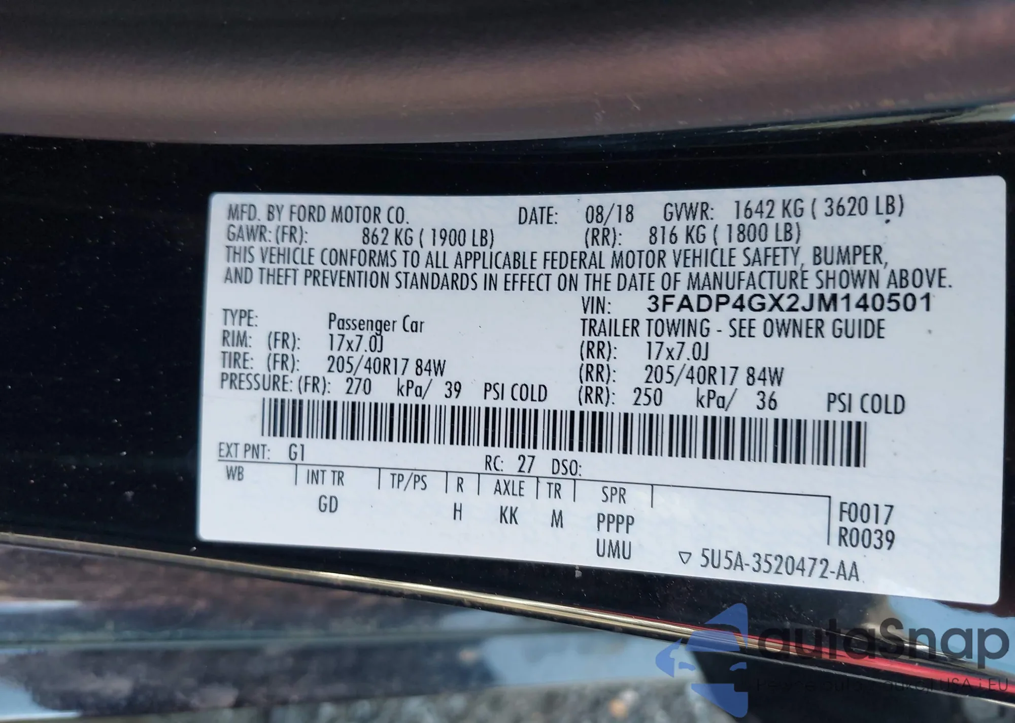 LOT: 42391626 VIN: 3FADP4GX2JM140501