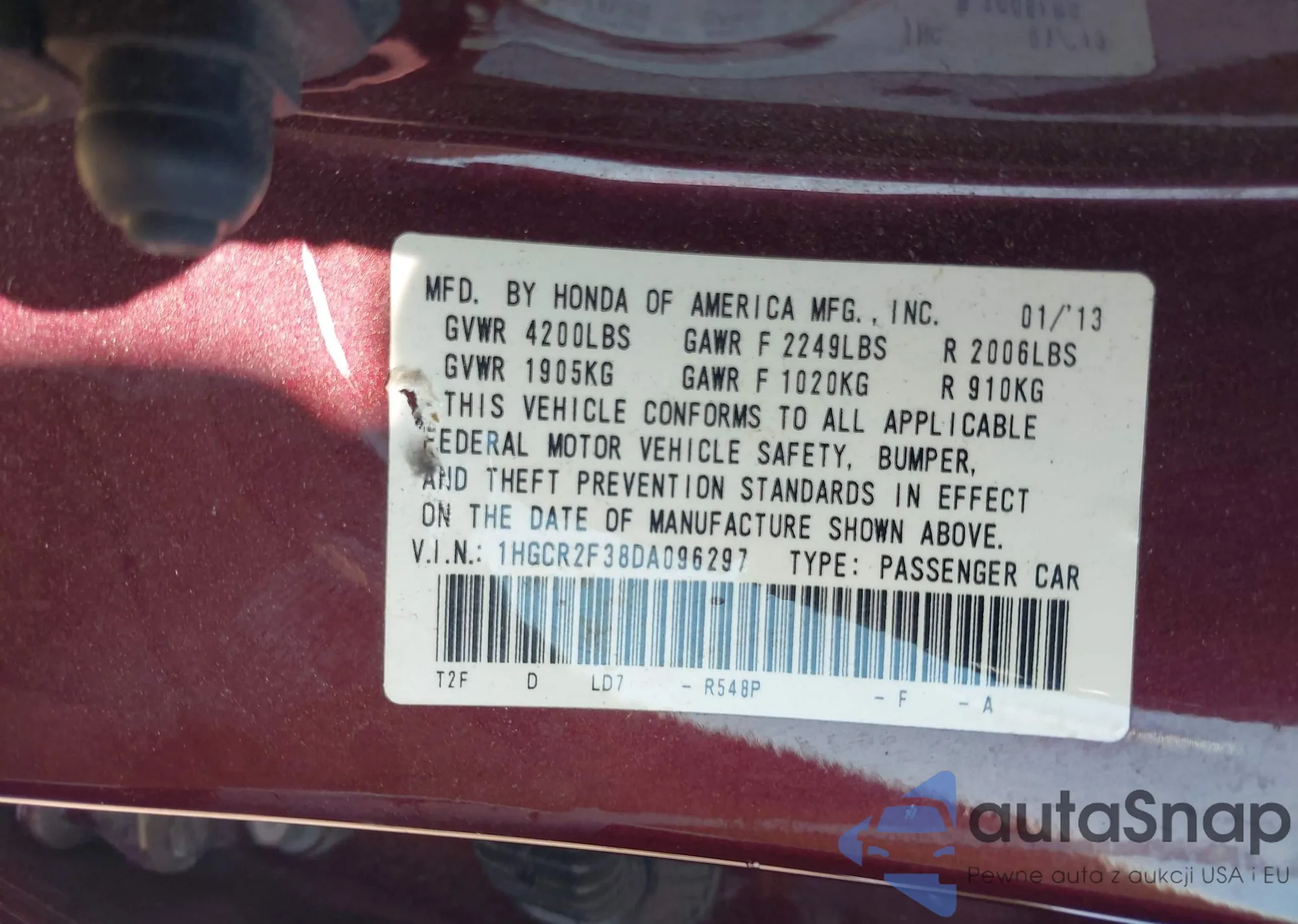 LOT: 42568093 VIN: 1HGCR2F38DA096297